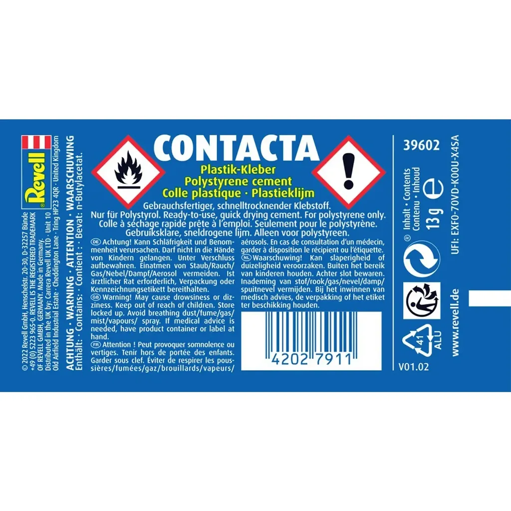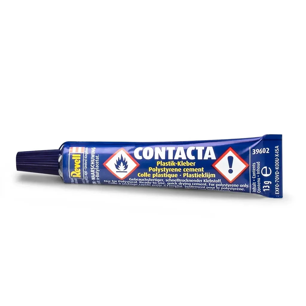 Contacta gel-lim fra Revell er en lim med lang tørretid. Artikel nummer 39602. Tuben indeholder 13 gram.