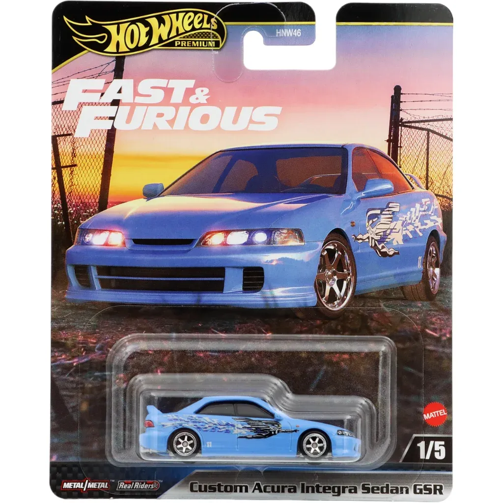 Blå Custom Acura Integra Sedan GSR fra Hot Wheels Premium og Fast & Furious Premium Series mix 3-serien fra 2024, hvor denne Integra er bil nummer 1 ud af 5.