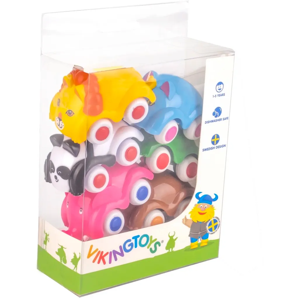 6 farverige dyrebiler fra Viking Toys i en gaveæske. Svensk design.