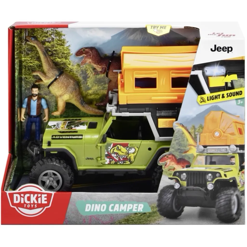 Dino Camper er en legetøjsjeep med lyd og lys. Der medfølger to dinosaurer og en dinosaurholder. Produktet er fremstillet af Dickie Toys.