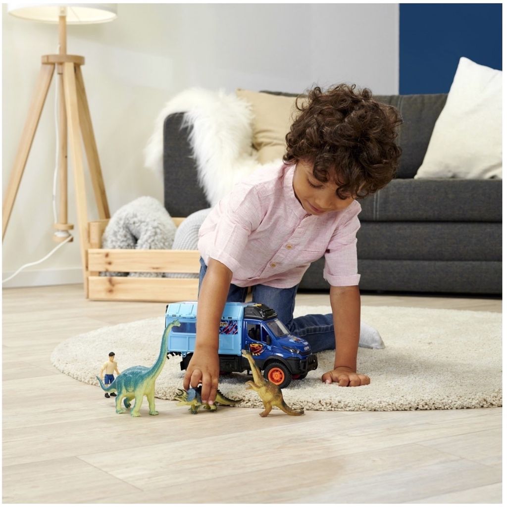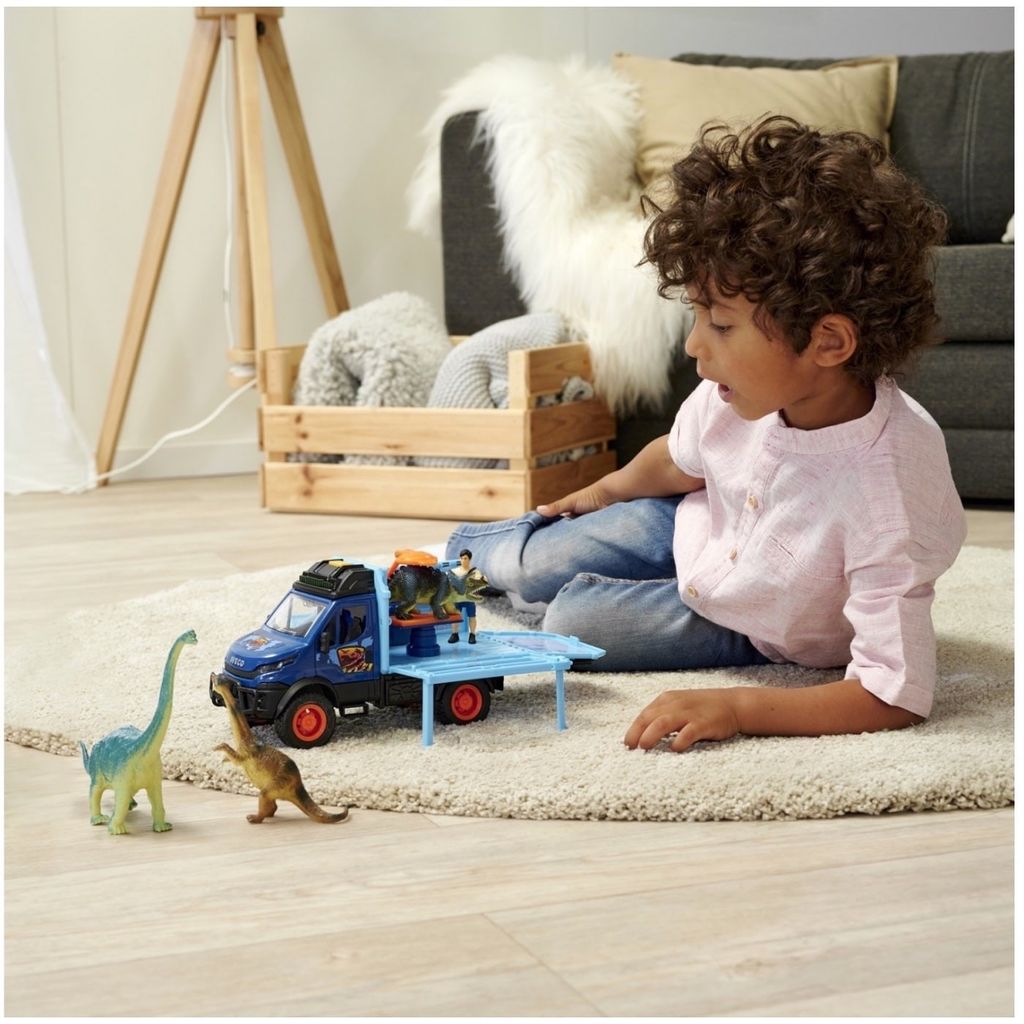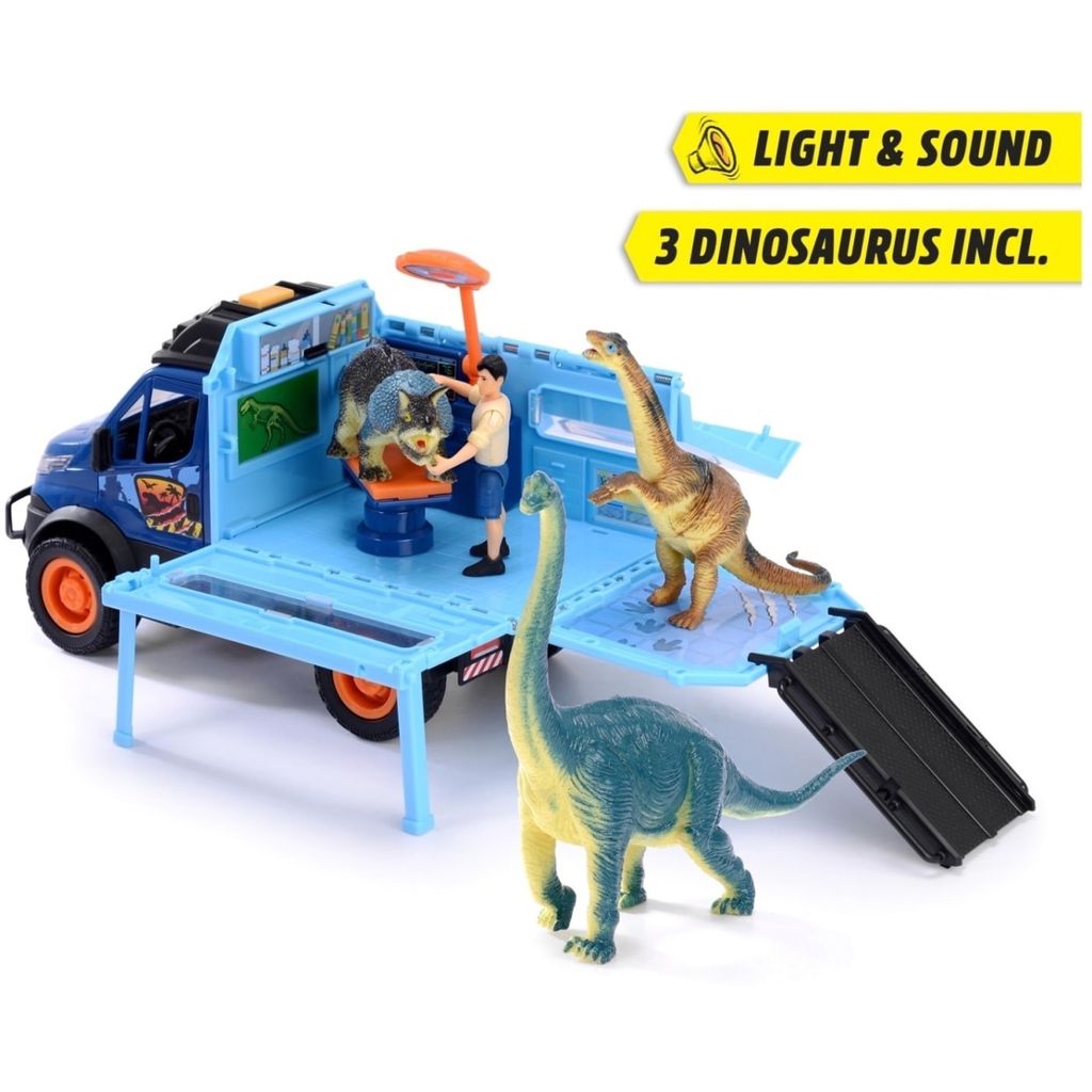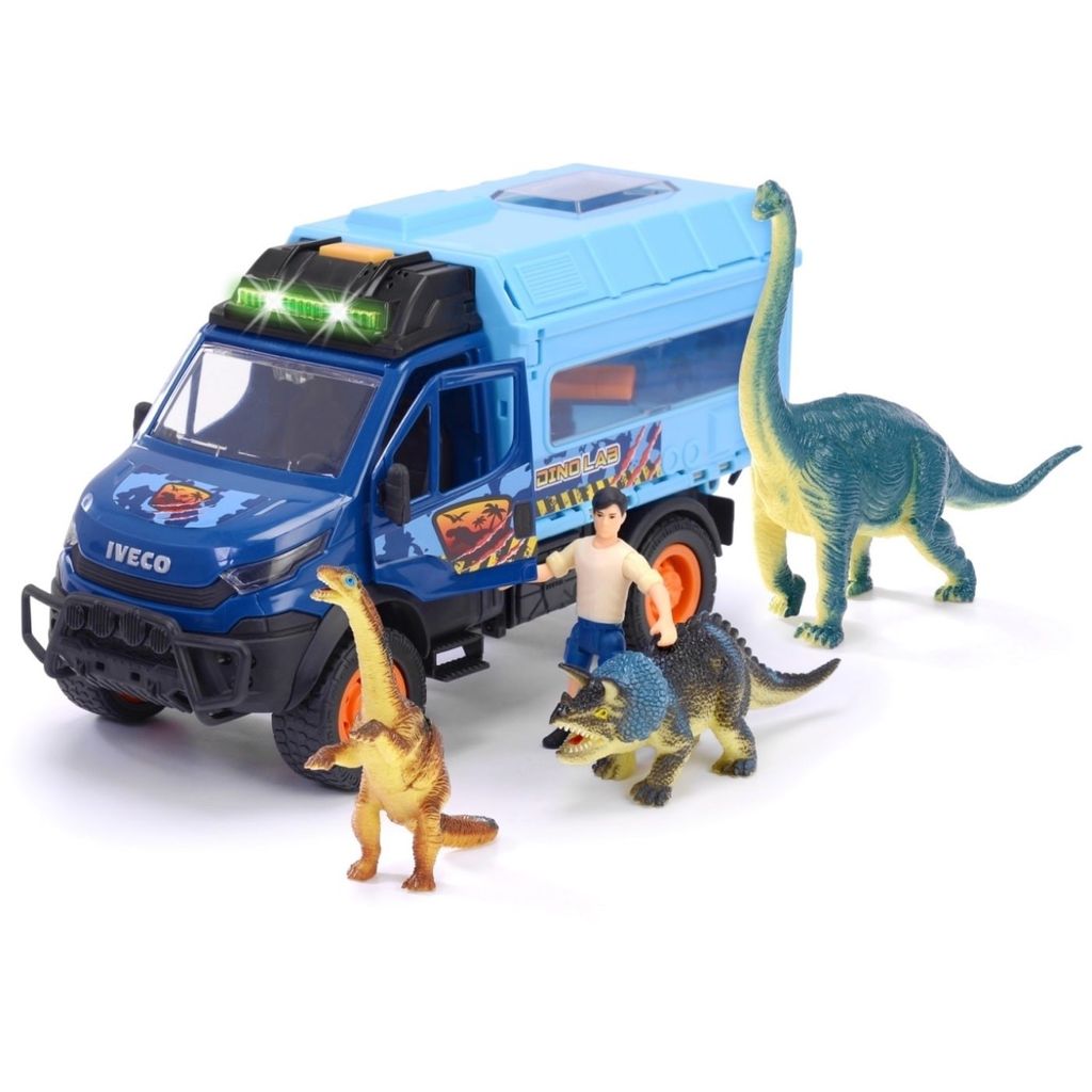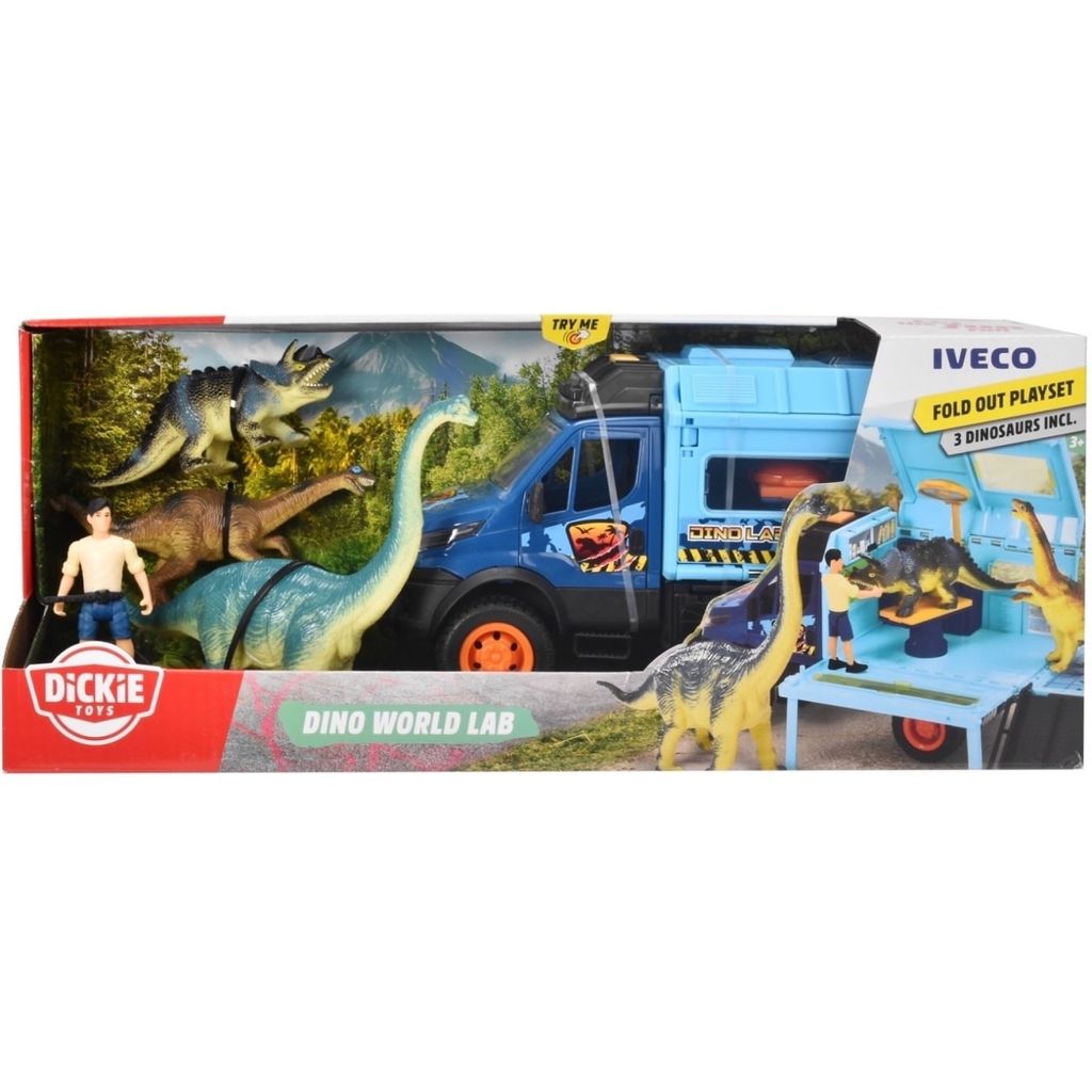 Dino World Lab fra Dickie Toys er et blåt Iveco-transportkøretøj. Den leveres med 3 dinosaurer og en dinosaurvogter. Bilen har lyd- og lysfunktioner.