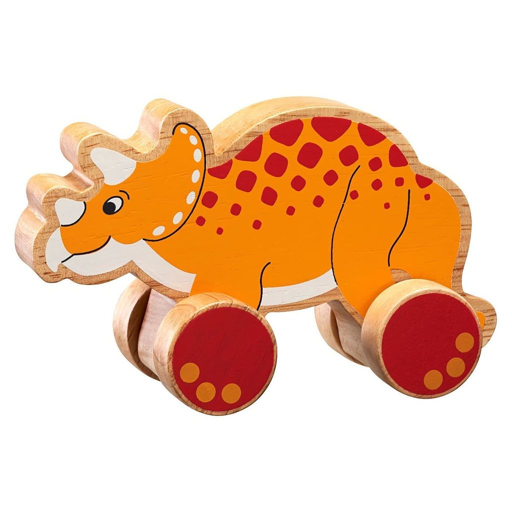 Dinosaur (i dette tilfælde en Triceratops) på hjul fremstillet af genbrugte gummitræer i Sri Lanka fra det britiske mærke Lanka Kade. Dinosauren er 2,5 cm tyk (den samlede bredde inklusive hjulene er 5,8 cm) og af høj kvalitet. Det rullende legetøj er naturligvis malet med giftfri maling på begge sider. Dinosauren anbefales til børn i alderen 1-5 år.