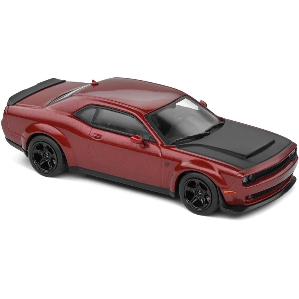 Modellen leveres i en akrylboks med en sort bundplade. På bundpladen står modelnavnet "Dodge Challenger 2018 - SRT Demon V8 6.2L" i sølv.