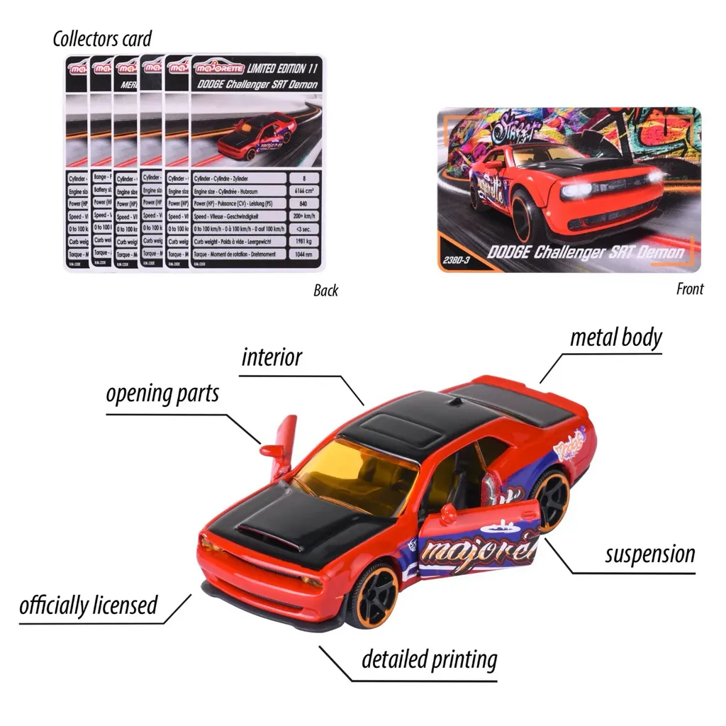 Rød Dodge Challenger SRT Demon fra Majorette and the Graffiti-serien, Limited Edition Series 11. Legetøjsbilen er 7,7 cm lang (skala 1:66) og har døre, der kan åbnes.