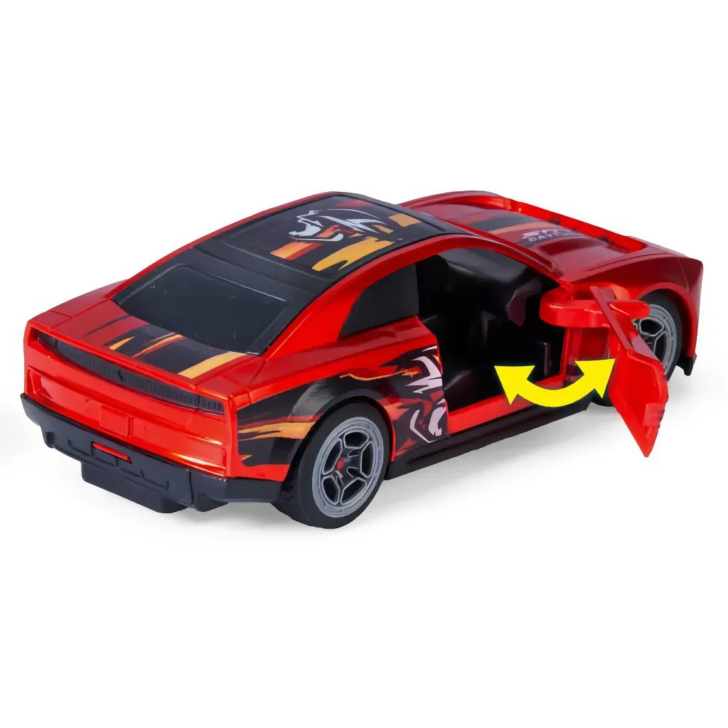 Legetøjsbilen har tilbagetrækning og døre, der kan åbnes. Forhjulene kan drejes.