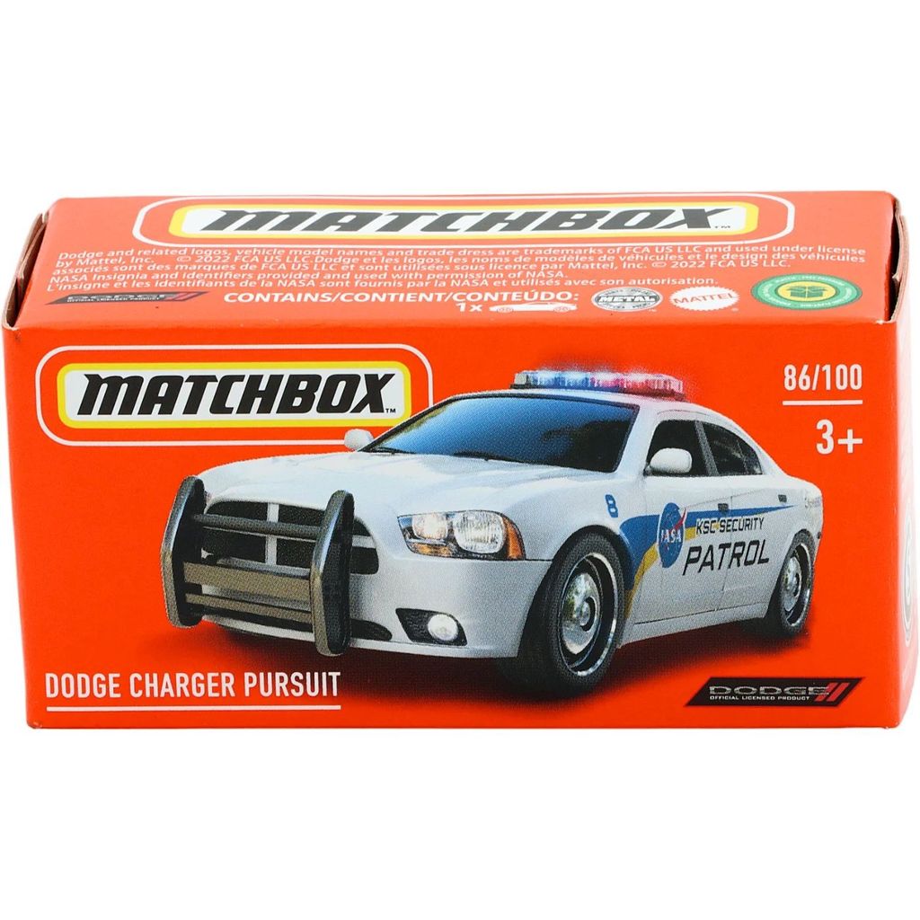 Dodge Charger Pursuit ("politibil" med NASA-logo og teksten "KSC Security Patrol") fra Matchbox og Power Grab-serien, hvor denne legetøjsbil er bil nummer 86/100.