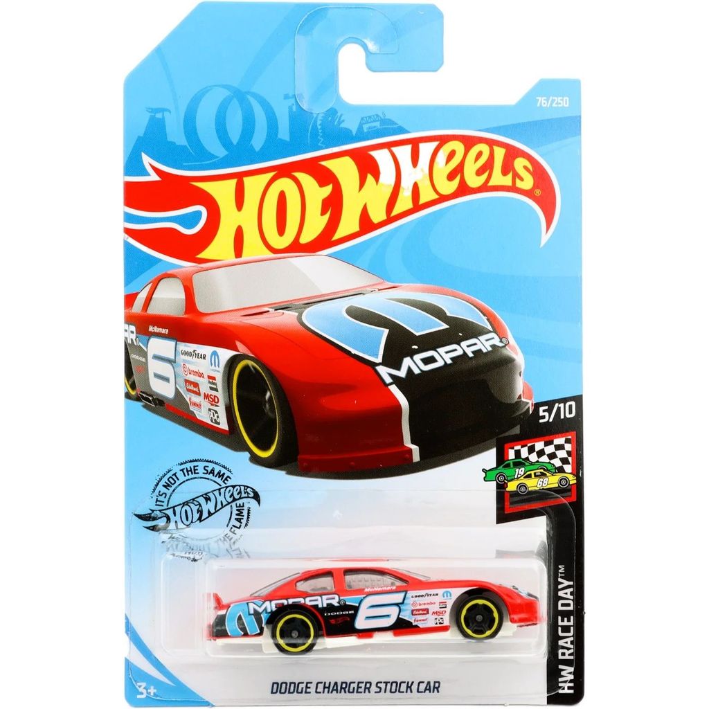Dodge Charger Stock Ca fra Hot Wheels og HW Race Day-serien, hvor denne legetøjsbil er bil nummer 5/10. Bilen er inkluderet i L-kassen "internationale lange kort" (C4982) 2019.