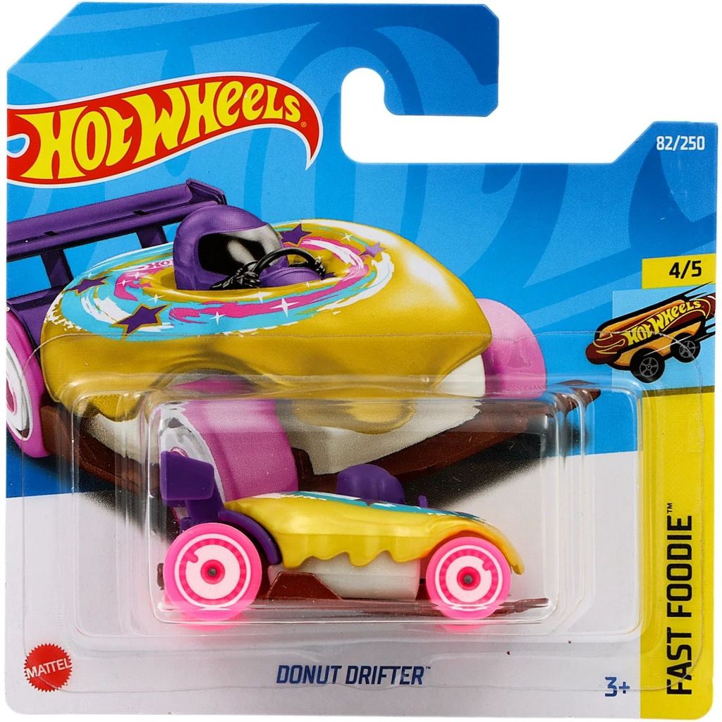Donut Drifter fra Hot Wheels og Fast Foodie-serien, hvor denne legetøjsbil er bil nummer 4/5. Bilen er nummer 82/250 fra 2022 og har et kort kort (5785).