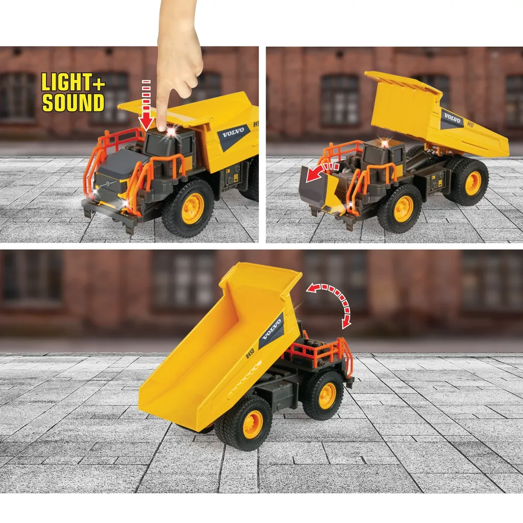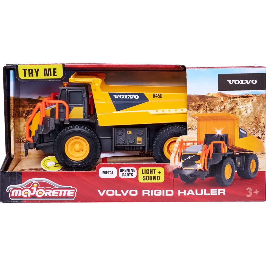 Dumper fra Majorette Grand-serien. Dumperen er en Volvo R45D i legetøjsversion og måler 20 centimeter i længden. Legetøjsdumperen har lyd- og lysfunktioner, som drives af to AAA-batterier, der er installeret i dumperen, men du er velkommen til at købe ekstra. Dumperen har en orange advarselslampe på taget og to forlygter, som alle tændes af batterierne. Lydene består af motorstøj og horn.