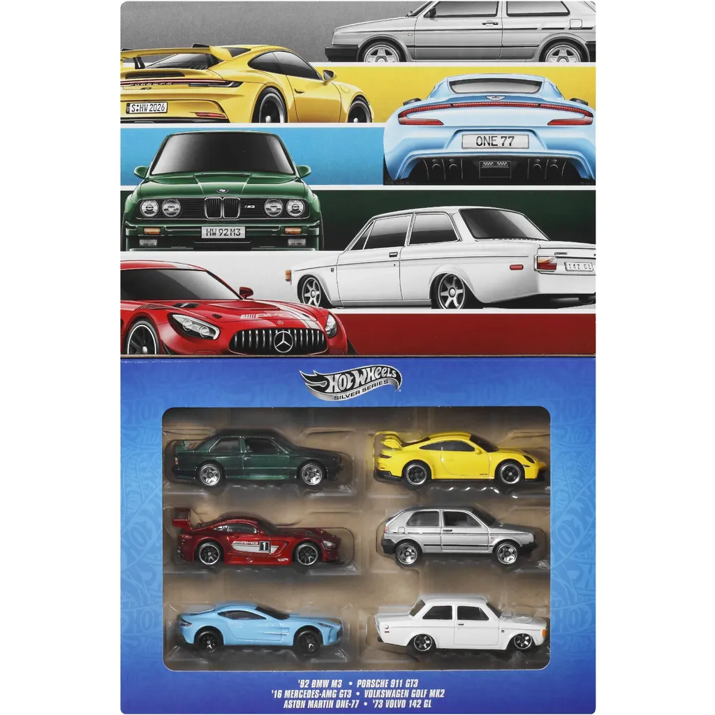 Seks legetøjsbiler fra European Car Culture og Hot Wheels i denne multipack, inklusive en hvid Volvo 142.