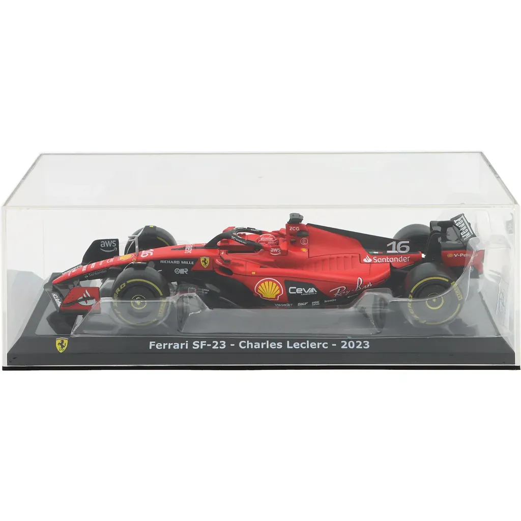 Modellen leveres i en flot akrylæske (showcase) med en sort bundplade og teksten "Ferrari SF-23 - Charles Leclerc - 2023".