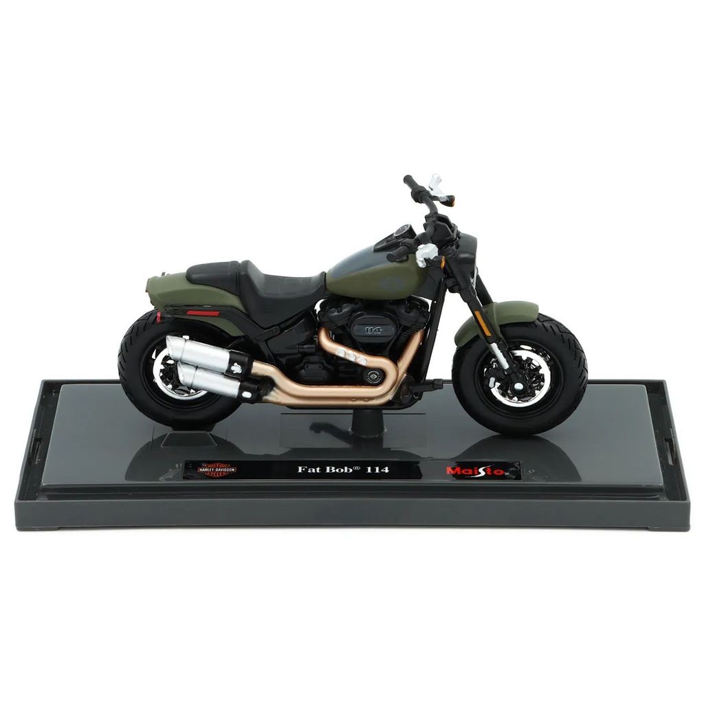 Motorcyklen er monteret på en bundplade med motorcyklens navn "Fat Bob 114" og Harley-Davidson- og Maisto-logoerne. Pladen får motorcyklen til at skille sig ud på hylden.
