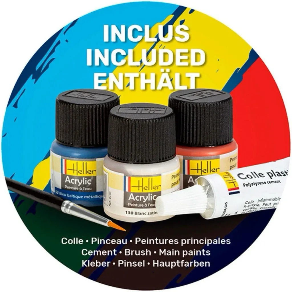 Ud over modellen følger der en pensel, lim og fire akrylfarver med i henhold til denne liste:
