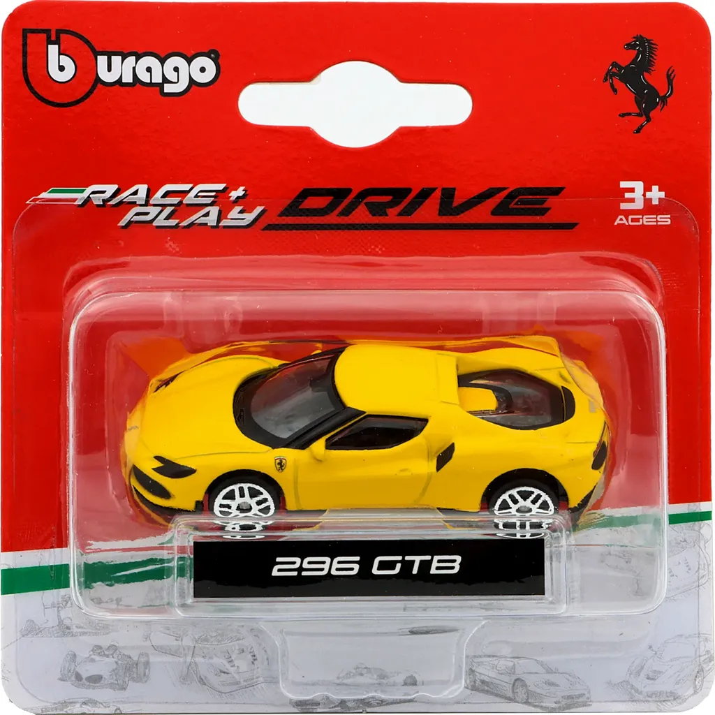 Gul Ferrari 296 GTB som legetøjsbil fra italienske Bburago i skala 1:64 (7 cm lang).