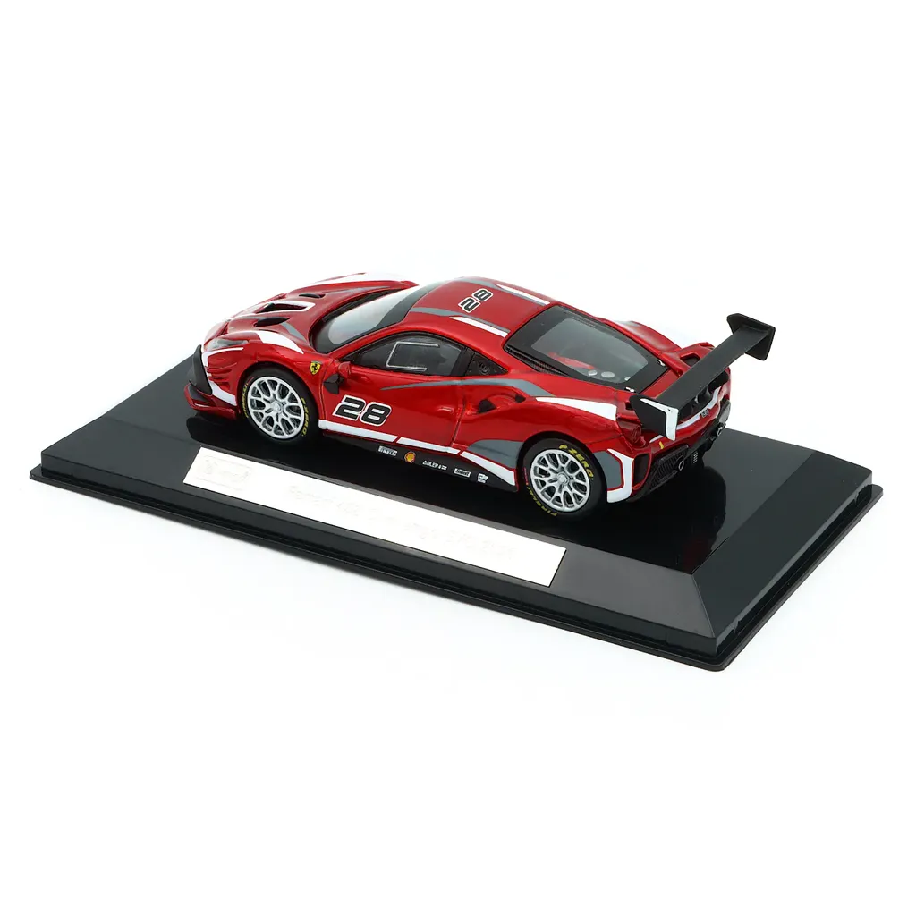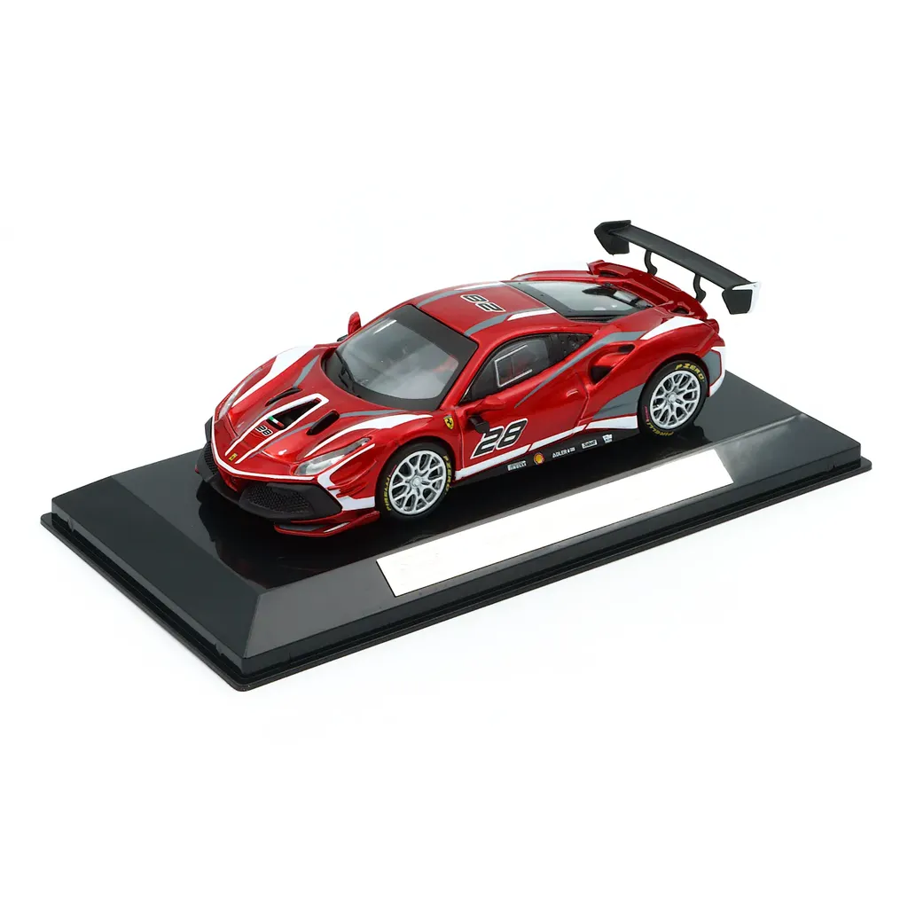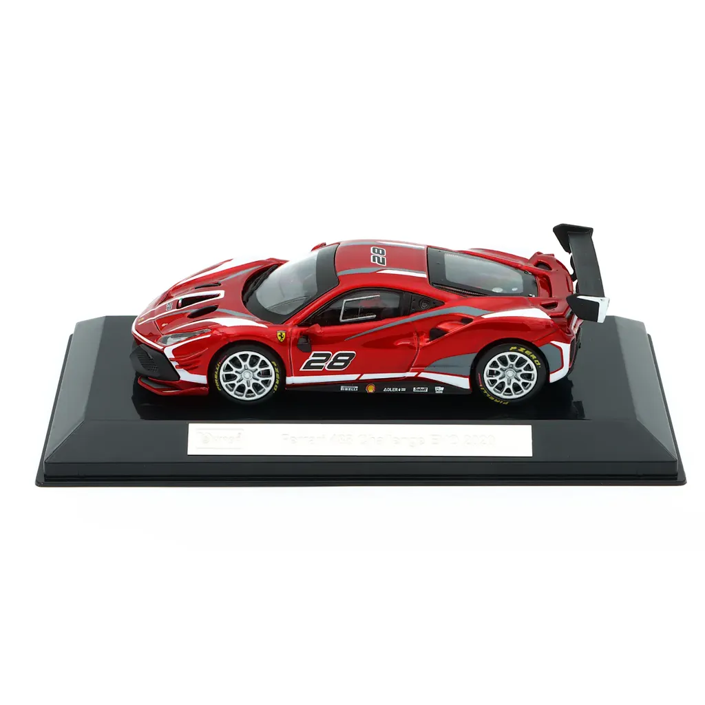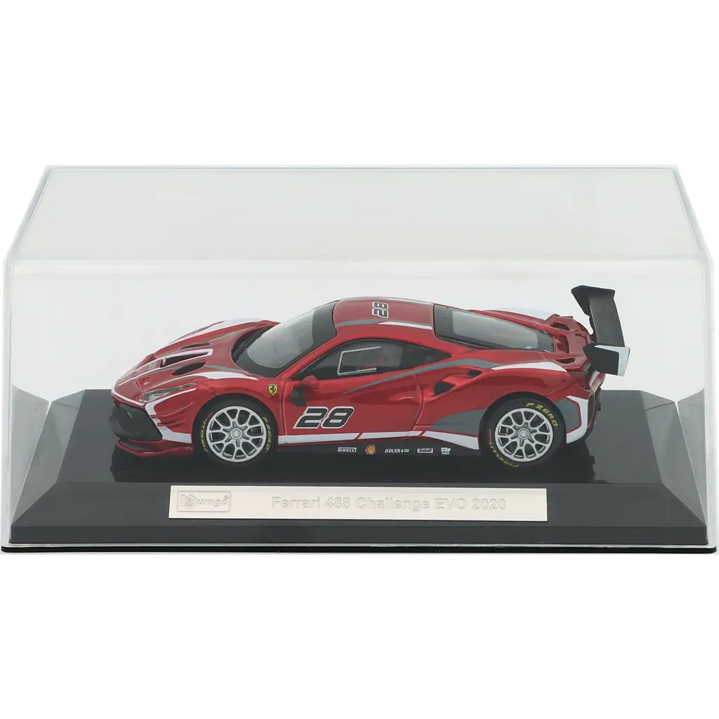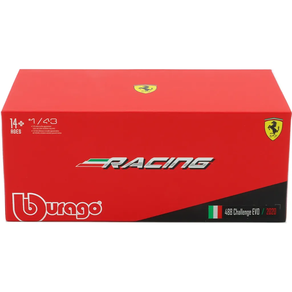Rød Ferrari 488 Challenge Evo, modelår 2020, som modelbil fra Bburago og Racing-serien i skala 1:43 (ca. 11 cm).