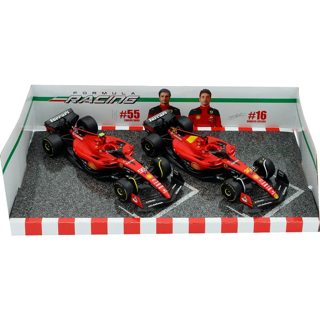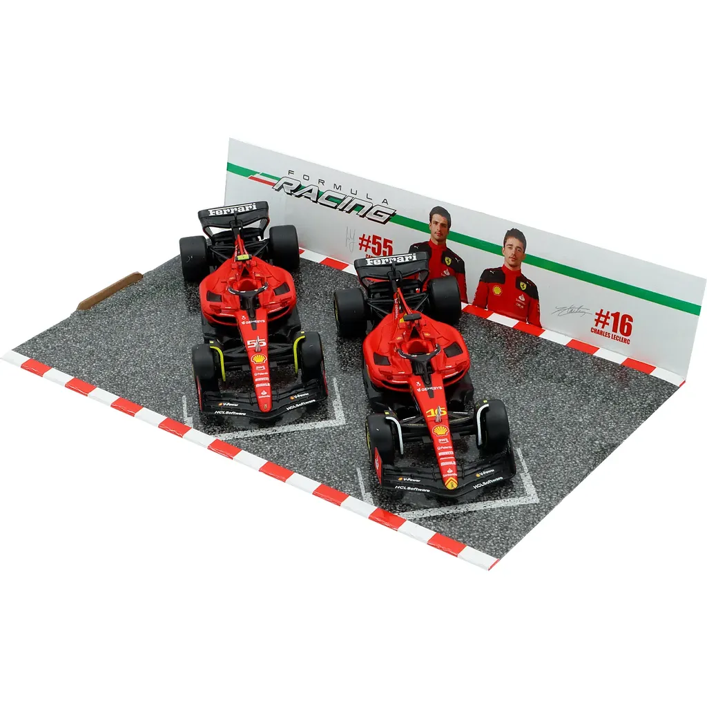 Sæt med to F1-biler fra Ferrari. Bilerne (begge SF-23) blev kørt af Carlos Sainz og Charles Leclerc i 2023. Sættet er fra Bburago, og bilernes målestok er 1:43 (ca. 13 cm pr. bil).