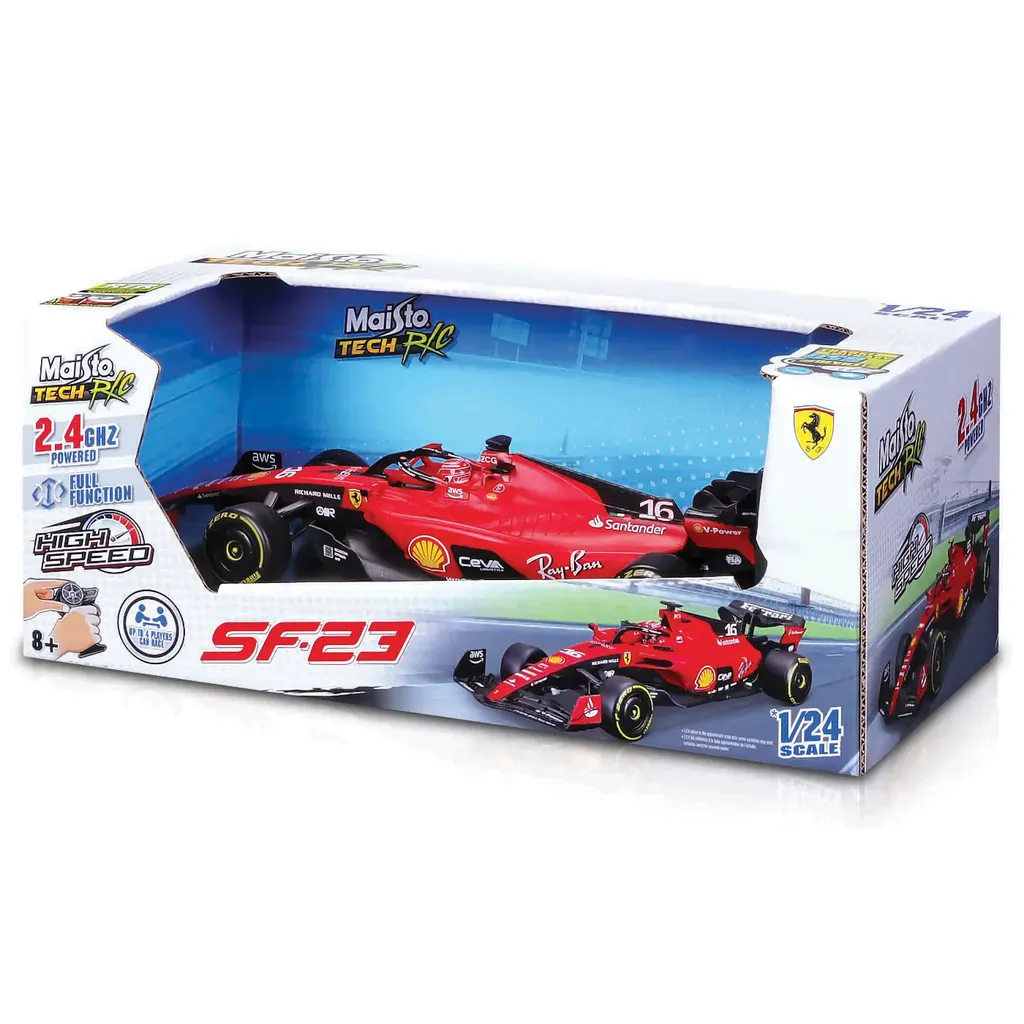 Radiostyret Ferrari SF-23 (Formel 1-bil med nummer 16 kørt af Charles Leclerc i sæsonen 2023) fra Maisto i skala 1:24 (23 cm lang).