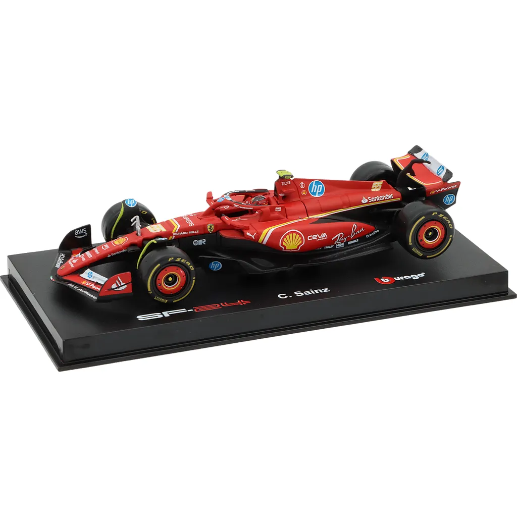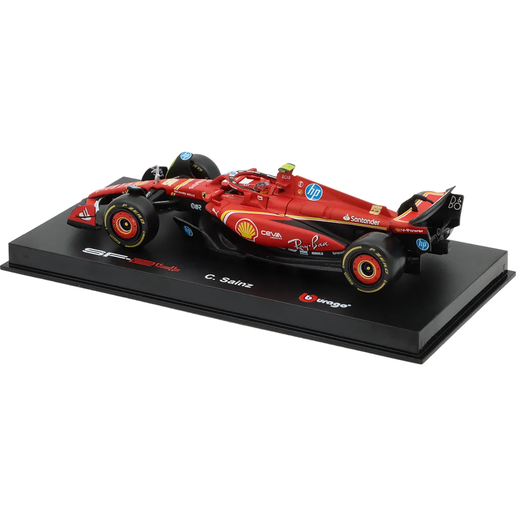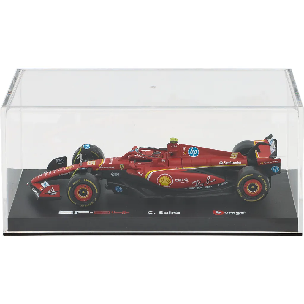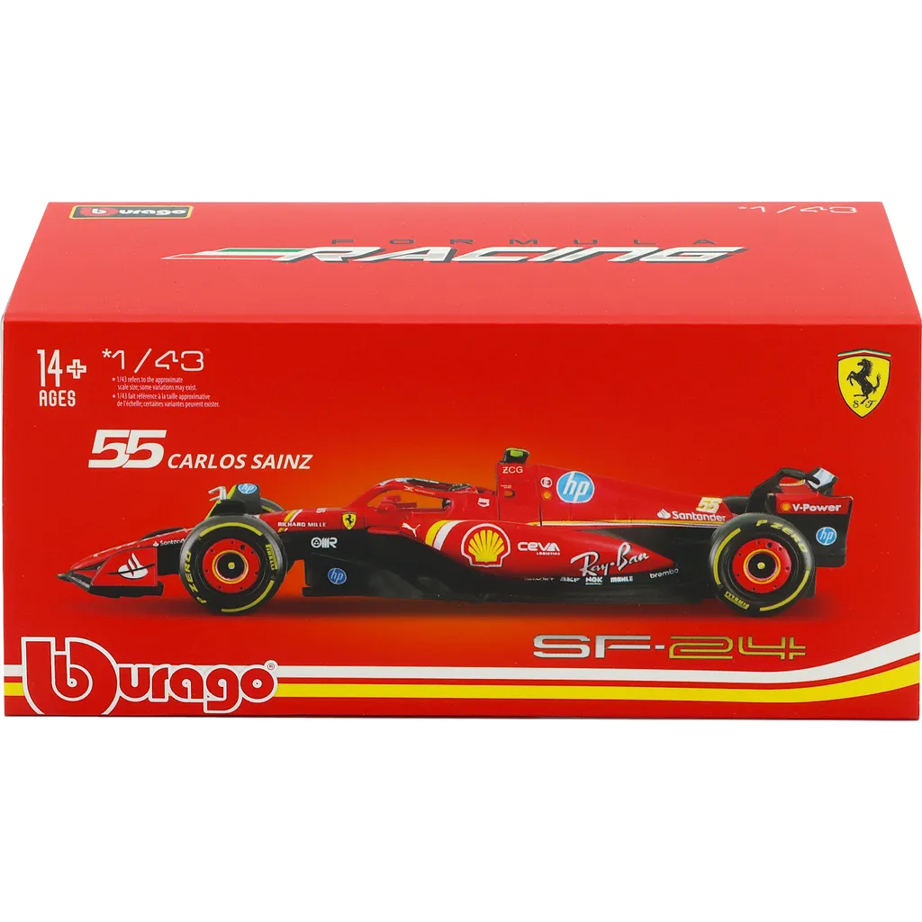 Ferrari SF-24 med nummer 55 blev kørt af Carlos Sainz i sæsonen 2024. Denne modelbil er lavet af Bburago i skala 1:43, hvilket betyder, at den er 13 cm lang. Bilen leveres i en akrylboks.