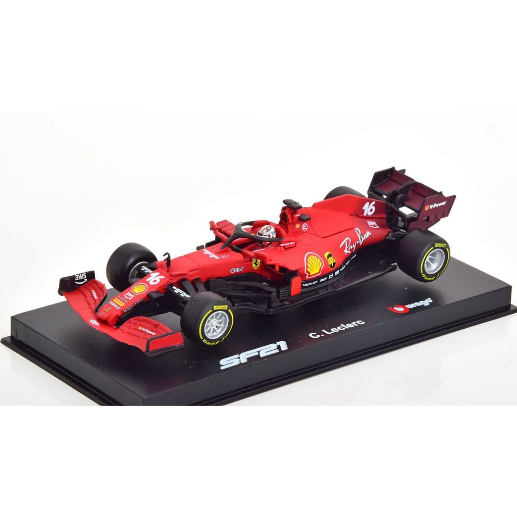 Formel 1-bil fra Bburago i skala 1:43. Bilen er en Ferrari SF21, der blev kørt af Charles Leclerc i sæsonen 2021. Modellen har én kører (Charles Leclerc) i bilen.