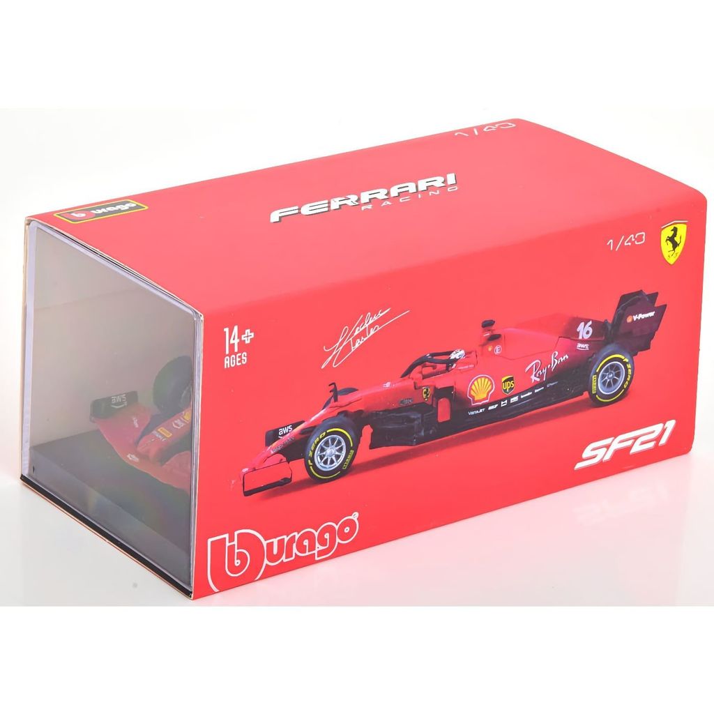 Formel 1-bil fra Bburago i skala 1:43. Bilen er en Ferrari SF21 med nummer 16, der blev kørt af Charles Leclerc i sæsonen 2021. Modellen har en kører (Charles Leclerc) i bilen.