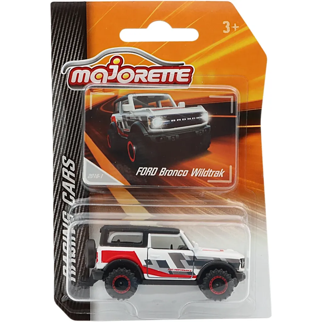 Hvid, sort og rød Ford Bronco Wildtrak fra Majorette og serien Racing Cars. Broncoen er 7,2 cm (skala 1:62) og lavet af metal med plastdetaljer.