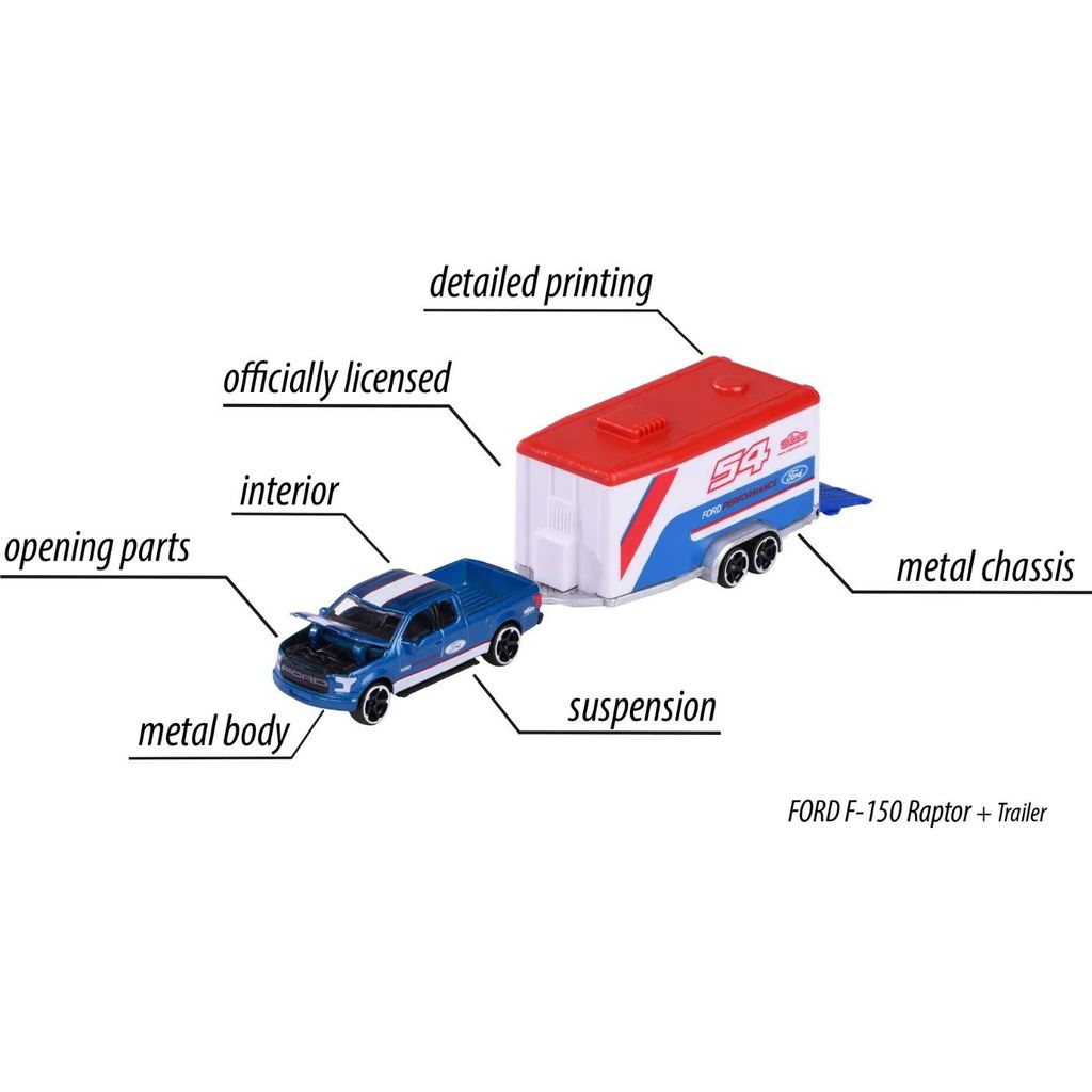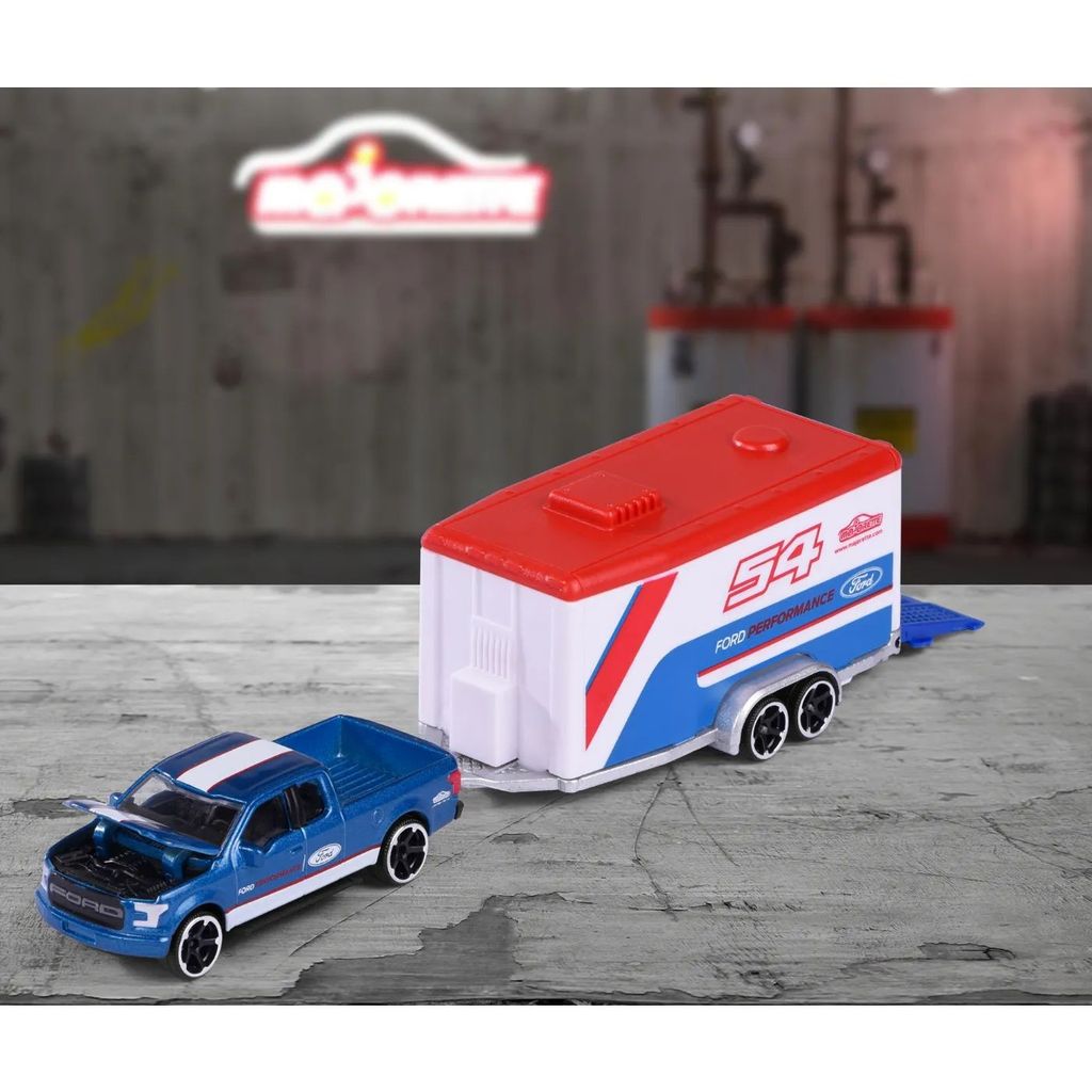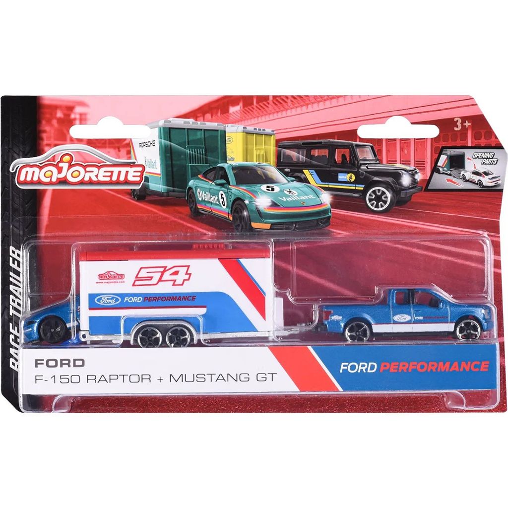 Race Trailer fra Majorette med en Ford F-150 Raptor, der trækker en overdækket trailer med en Ford Mustang GT. Bilerne udgør Ford Performance-racerteamet.