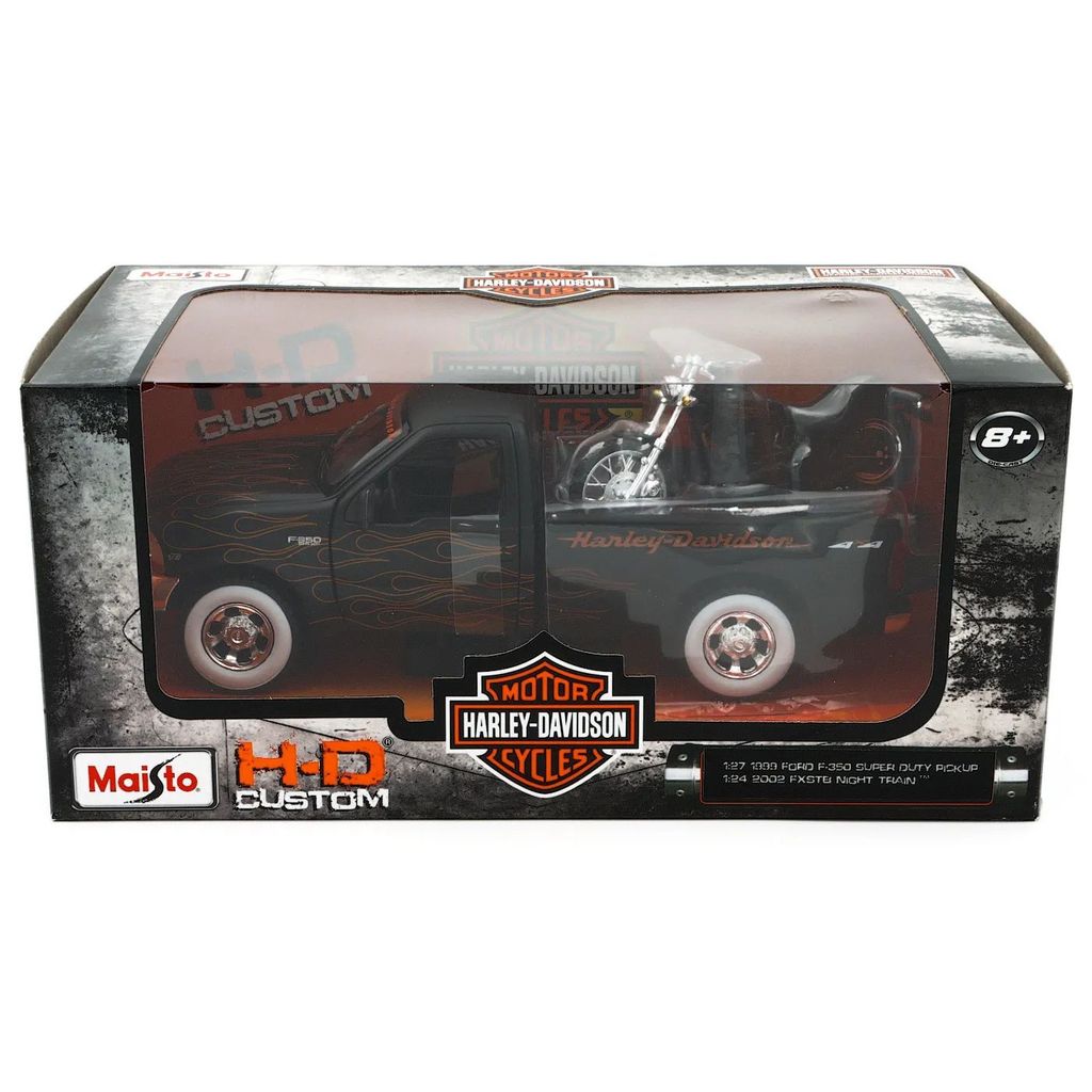 1999 Ford F-350 Super Duty Pickup med en Harley-Davidson 2002 FXSTB Night Train på ladet. Bilen er i skala 1:27 (20 cm), og motorcyklen er i skala 1:24 (9 cm).
