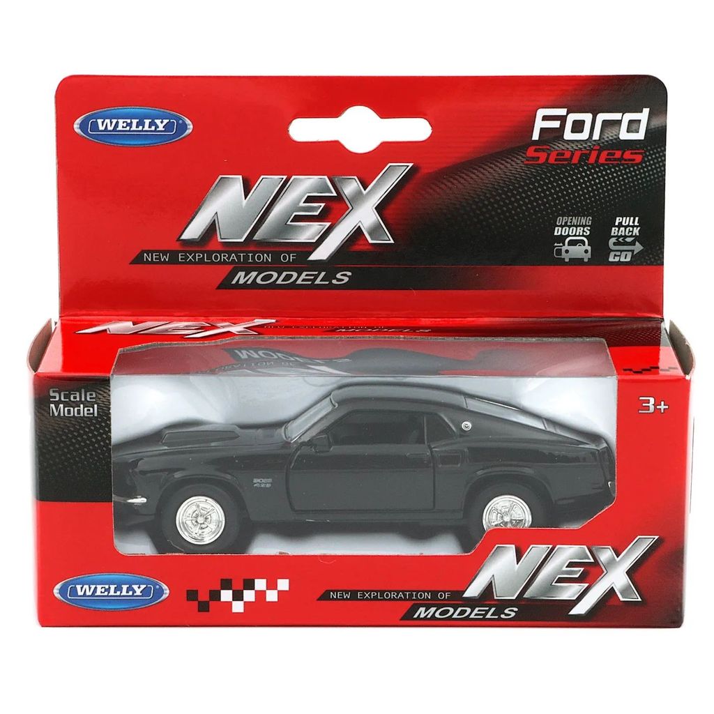Fra Welly og deres serie af NEX-modeller, Ford-serien, tilbyder vi denne sorte Ford Mustang Boss 429 med døre, der kan åbnes.