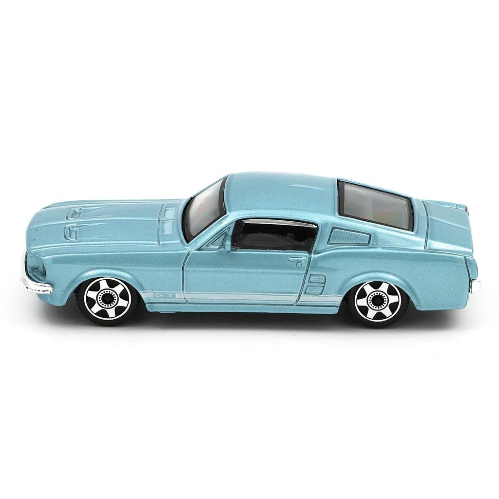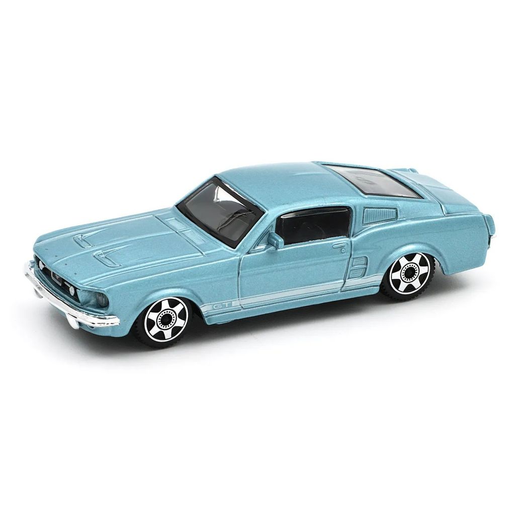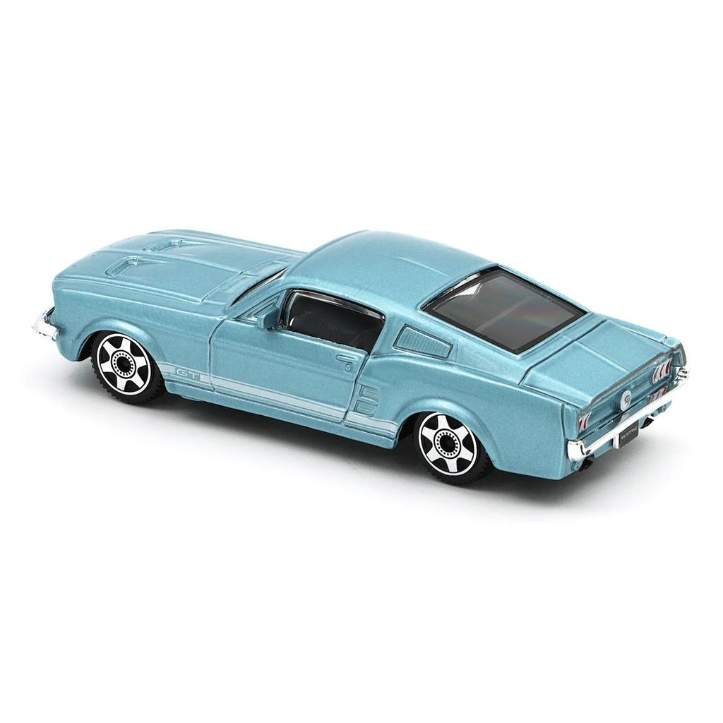 Ford Mustang GT, modelår 1967, i blå fra Bburago i skala 1:43 (længde 11 cm).