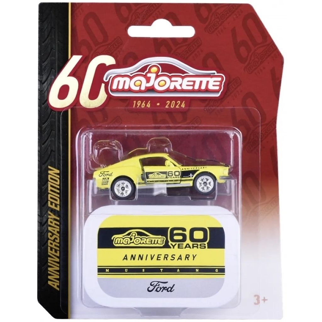 Gul og sort Ford Mustang fra Majorette og serien Anniversary Edition Deluxe Cars, der er udviklet til Majorettes 60-års jubilæum i 2024.