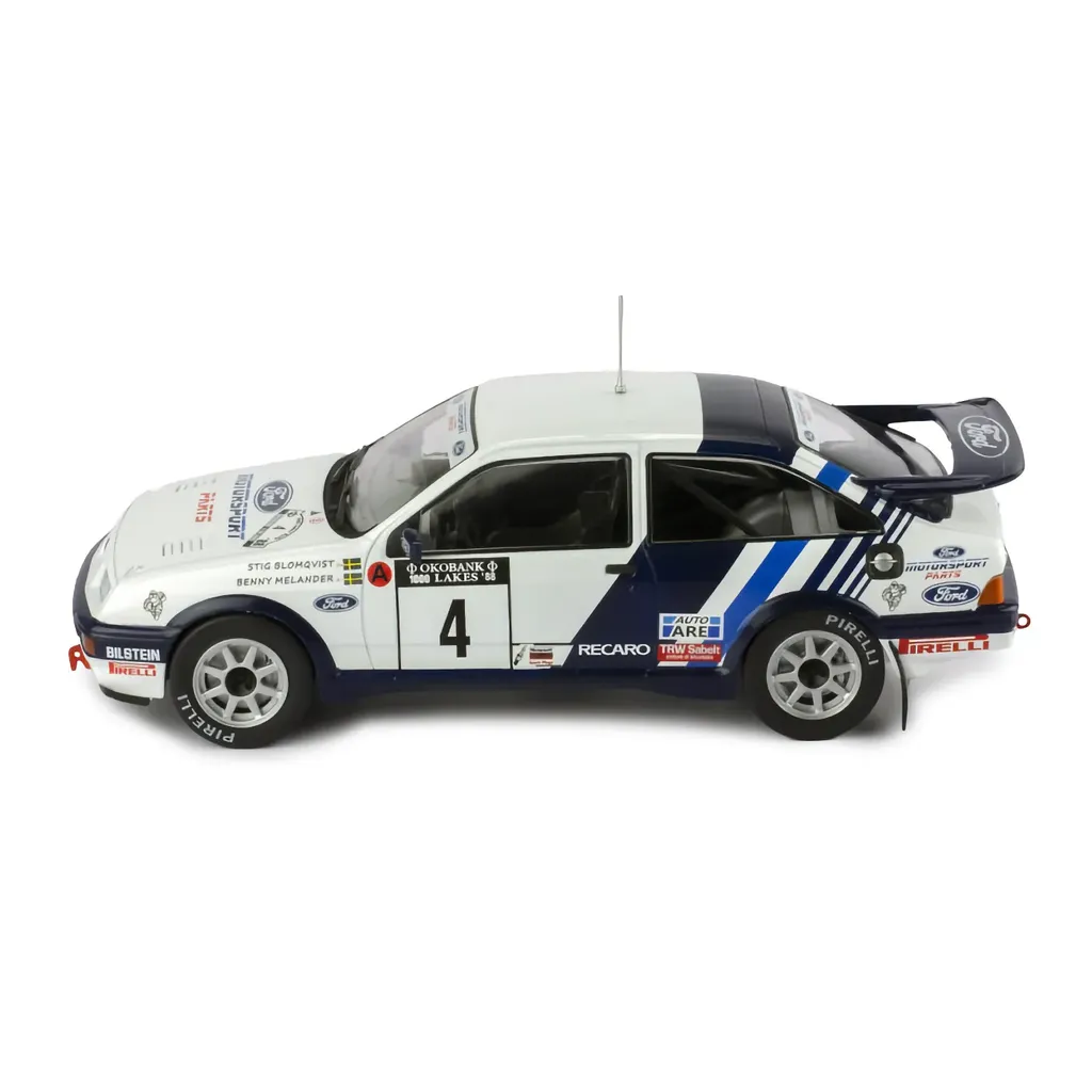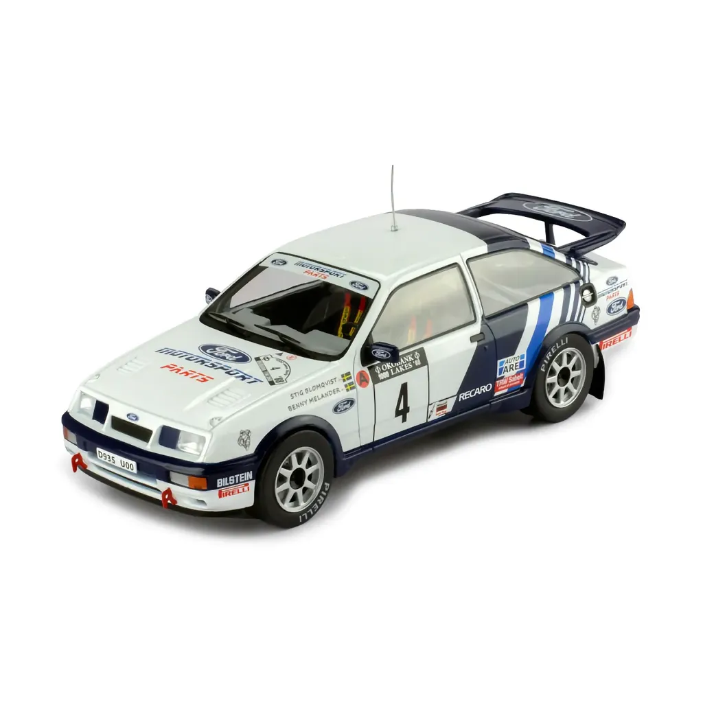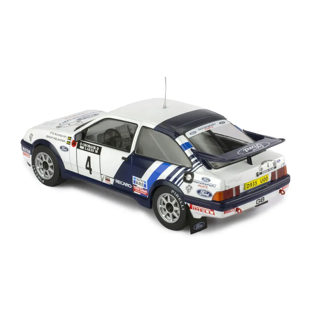 Ford Sierra RS Cosworth rallybil i skala 1:24 (19 cm) fra Ixo Models. Bilen blev kørt under det finske rally i 1988 af Stig Blomqvist og Benny Melander.