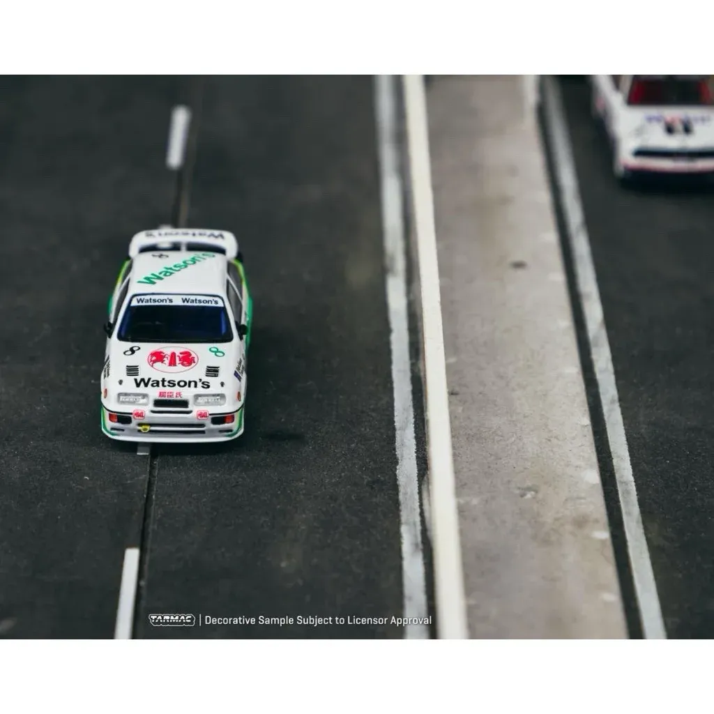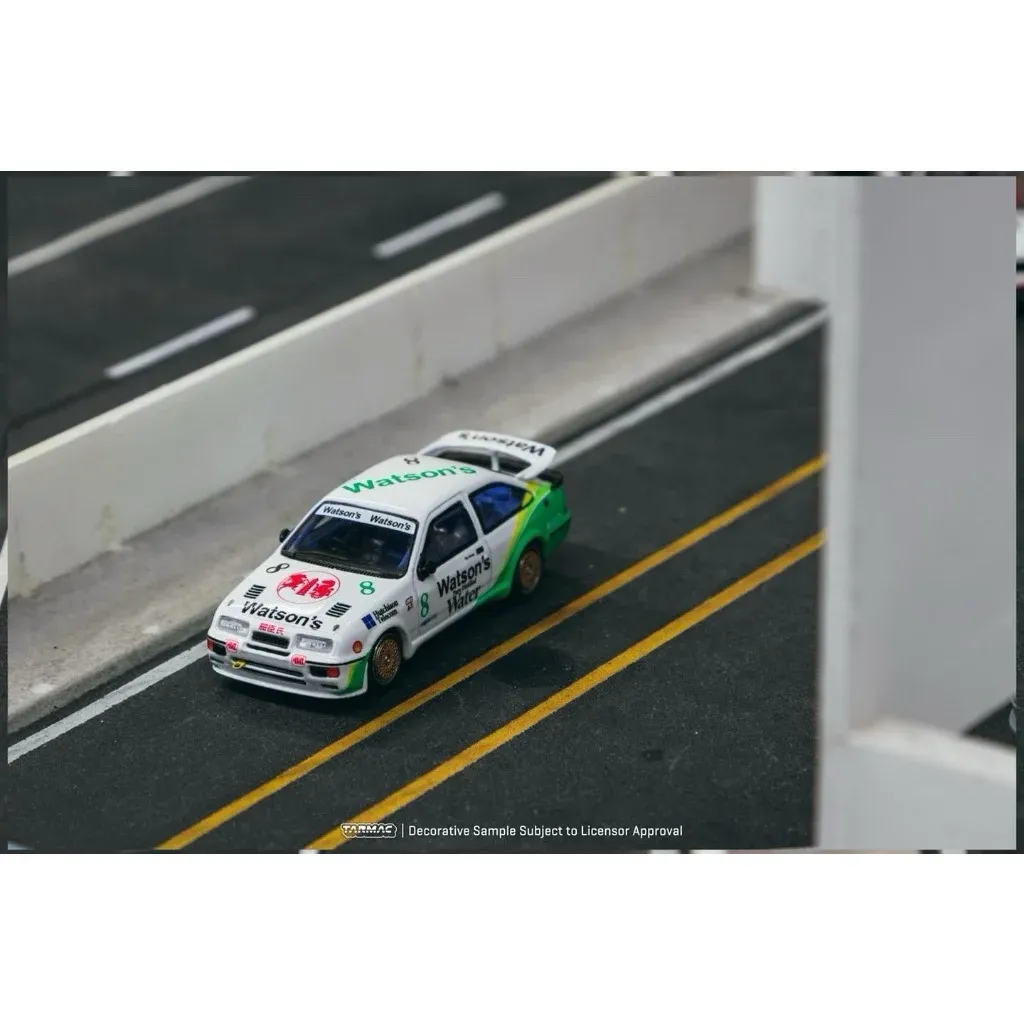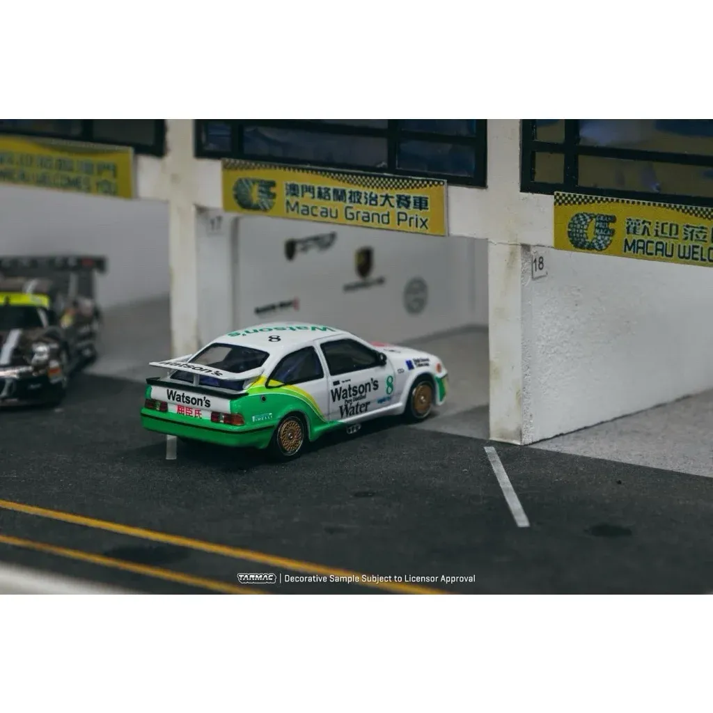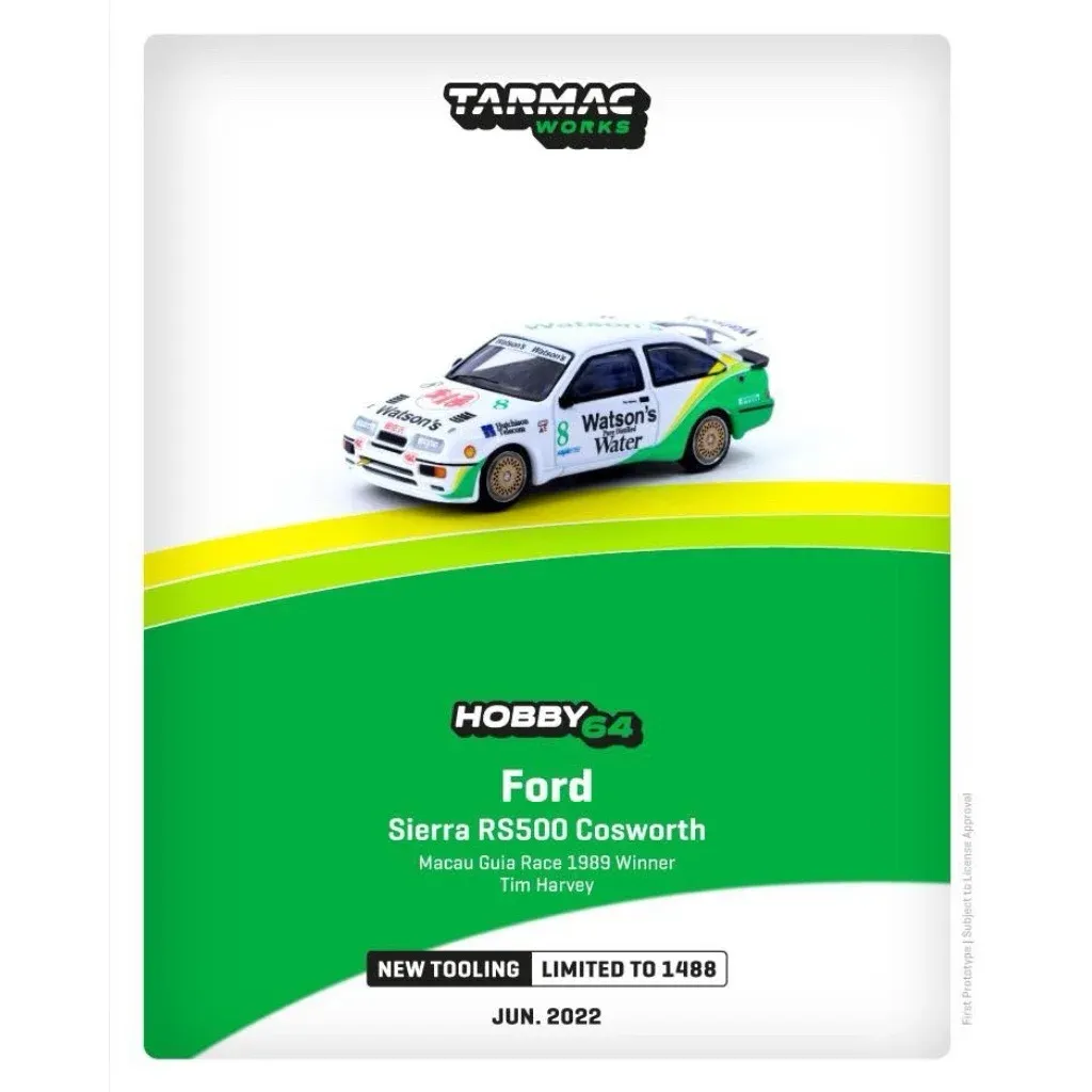 Ford Sierra RS500 Cosworth fra Tarmac Works og HOBBY64-serien. Ford'en blev kørt under Macau Guia Race i 1989 af Tim Harvey. Skalaen er 1:64 (7 cm).
