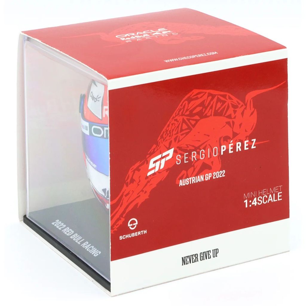 Minihjelm i skala 1:4, hvor Sergio Pérez' hjelm fra Østrigs GP 2022 er afbildet af Schuberth. I 2022-sæsonen kørte Sergio bil nr. 11 for Oracle Red Bull Racing-teamet.