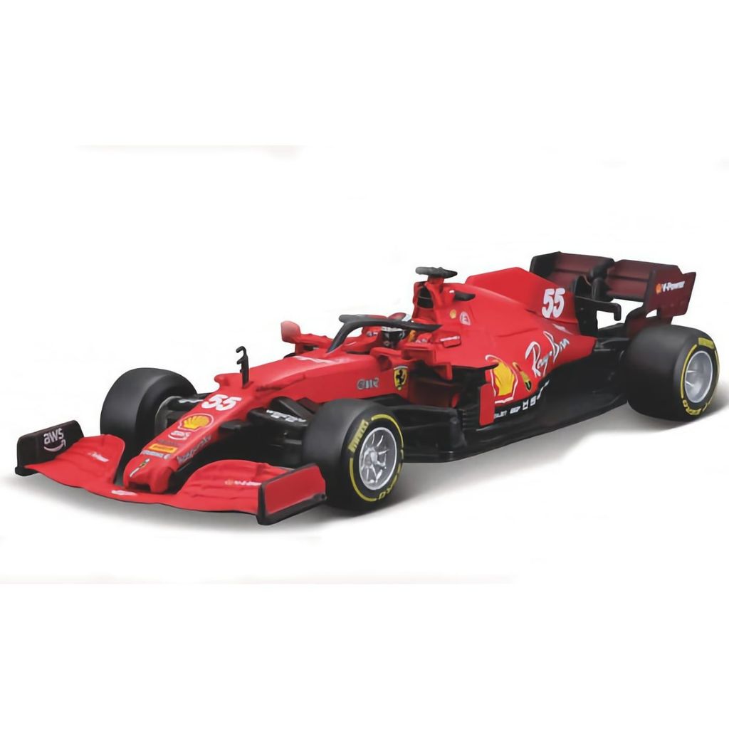 Formel 1-bilen Ferrari SF21 (nummer 55) som model fra Bburago i skala 1:43 (længde ca. 13 cm). Bilen blev kørt af Carlos Sainz i sæsonen 2021. Modellen har en kører (Carlos Sainz) i bilen.