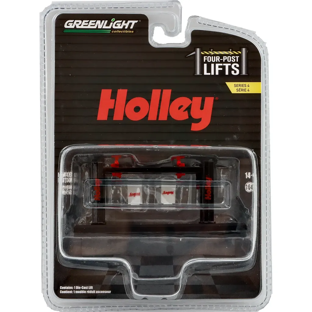 Lift med fire søjler fra GreenLight i skala 1:64. Liften er sort og rød med Holley-tema.