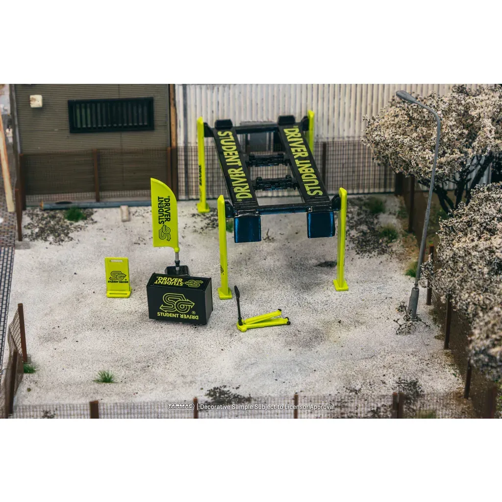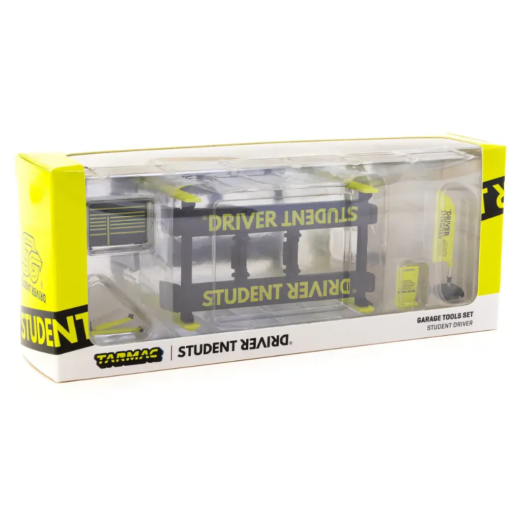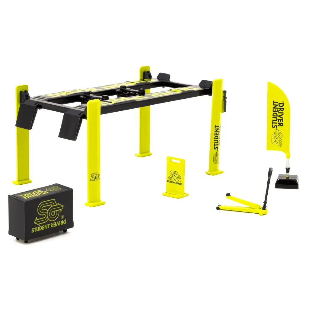 Sæt med søjlelifte og garagetilbehør fra Tarmac Works og PARTS64-serien i skala 1:64. Garagetilbehøret har et Student Driver-tema.