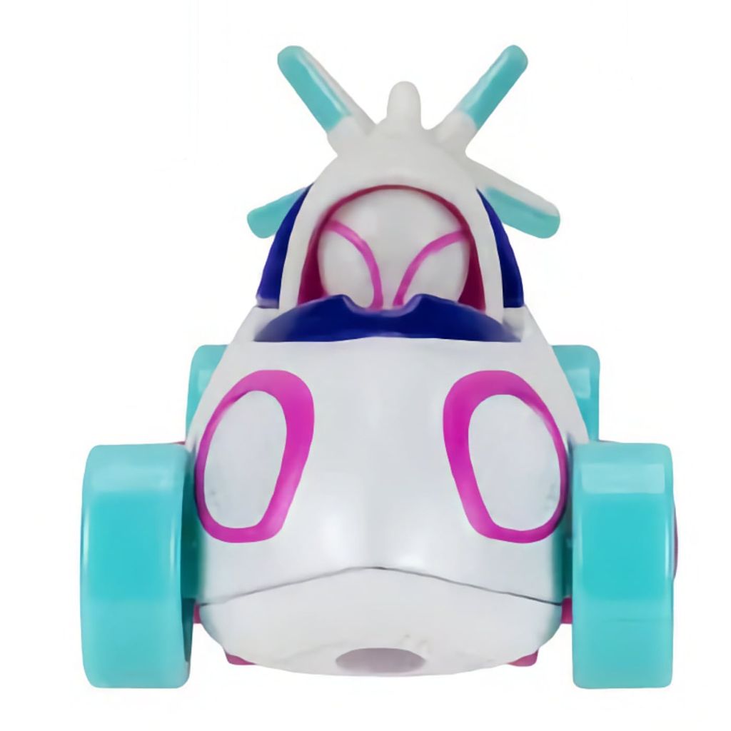 Ghost-Spider sidder i en hvid legetøjsbil, der er 7,3 cm lang. Bilen er en del af Amazing Metals-serien fra Jazwares og Disney Junior.