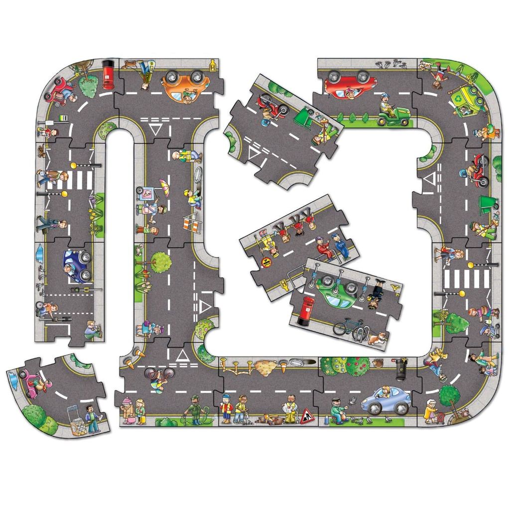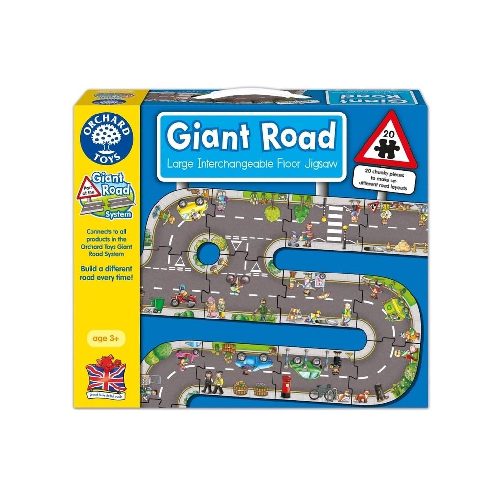 Et kæmpe vejpuslespil/gulvpuslespil, Giant Road fra Orchard Toys, der består af 20 brikker, hvor hver brik er 22 x 18 centimeter stor. Her sættes børnenes fantasi på prøve, da brikkerne kan sættes sammen på flere forskellige måder for at danne veje. Når vejen er bygget, kan man selvfølgelig lege med legetøjsbiler og køre på vejene. For at få en endnu længere vej kan man selvfølgelig kombinere flere puslespil.