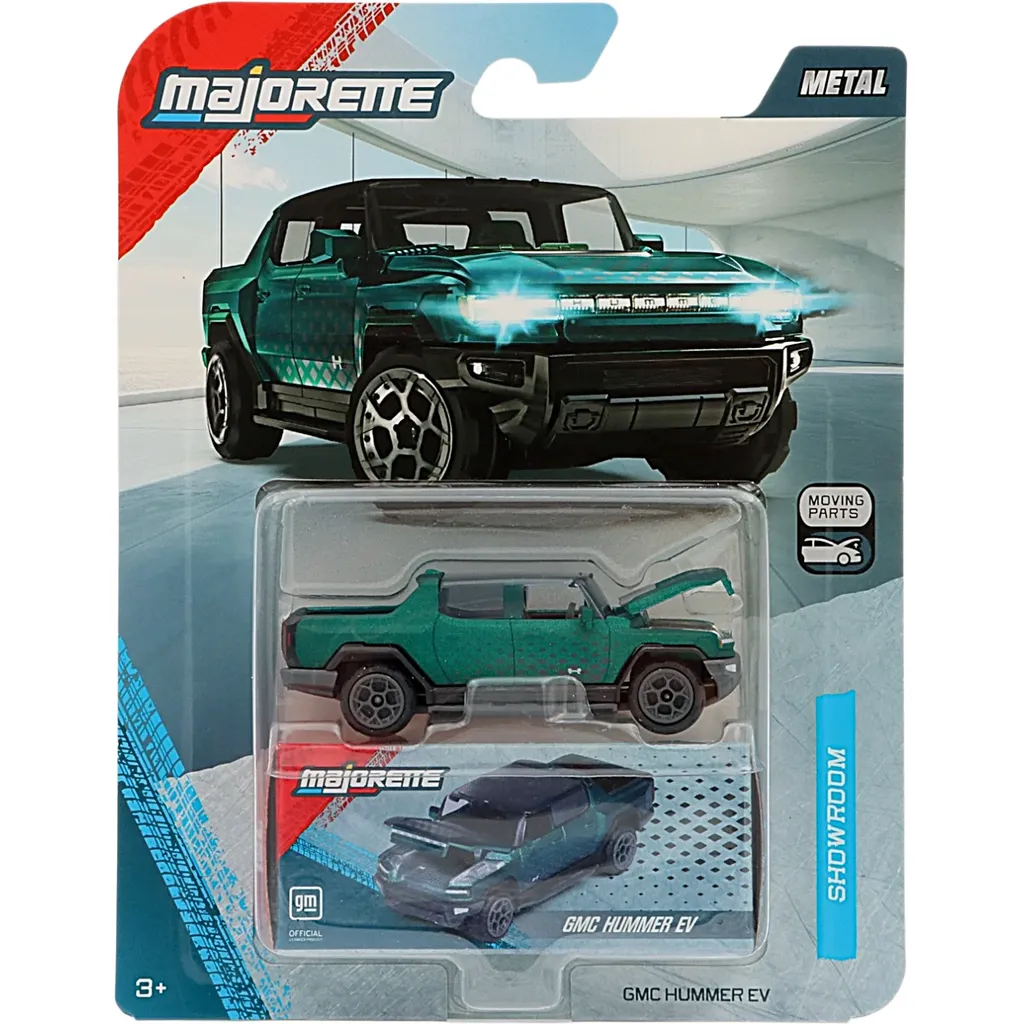 GMC Hummer EV fra Majorette og Showroom Deluxe Cars-serien. Bilen har gummidæk, er ca. 7 cm lang og fremstillet af metal med plastdetaljer.