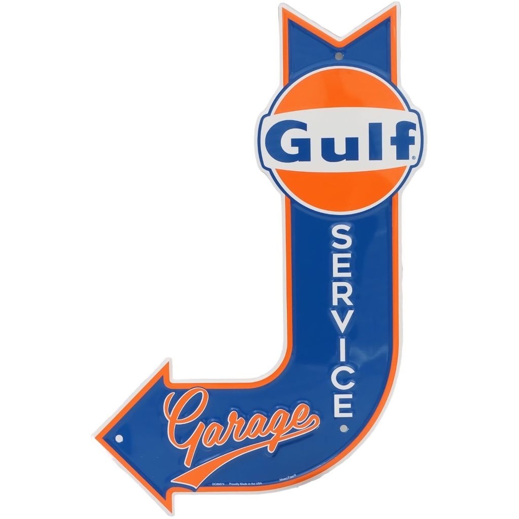 Pladeskilt med Gulf-logo og udformning af en pil med teksten Service Garage.