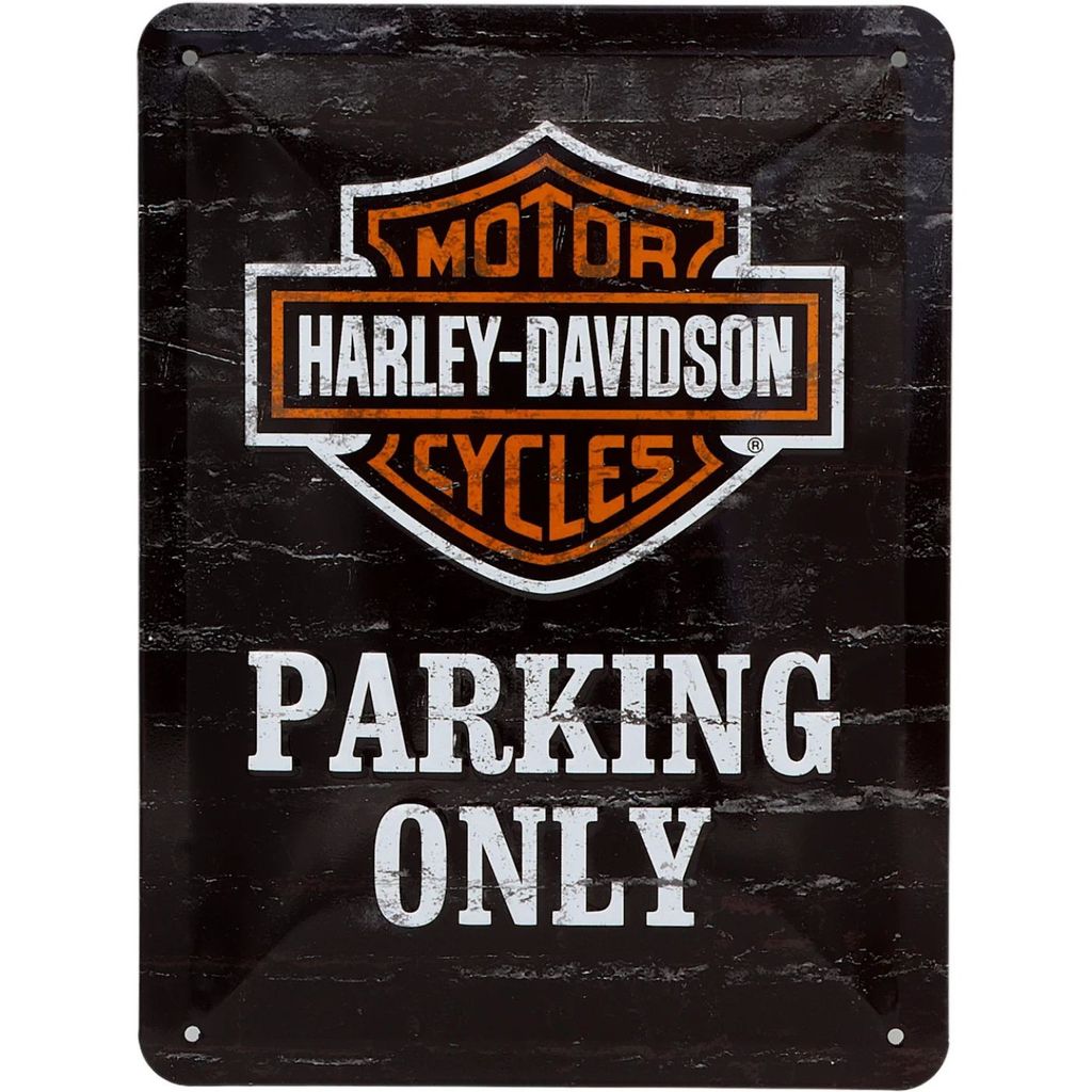 Pladeskilt med et Harley-Davidson-logo og teksten "Harley-Davidson - Parking Only".