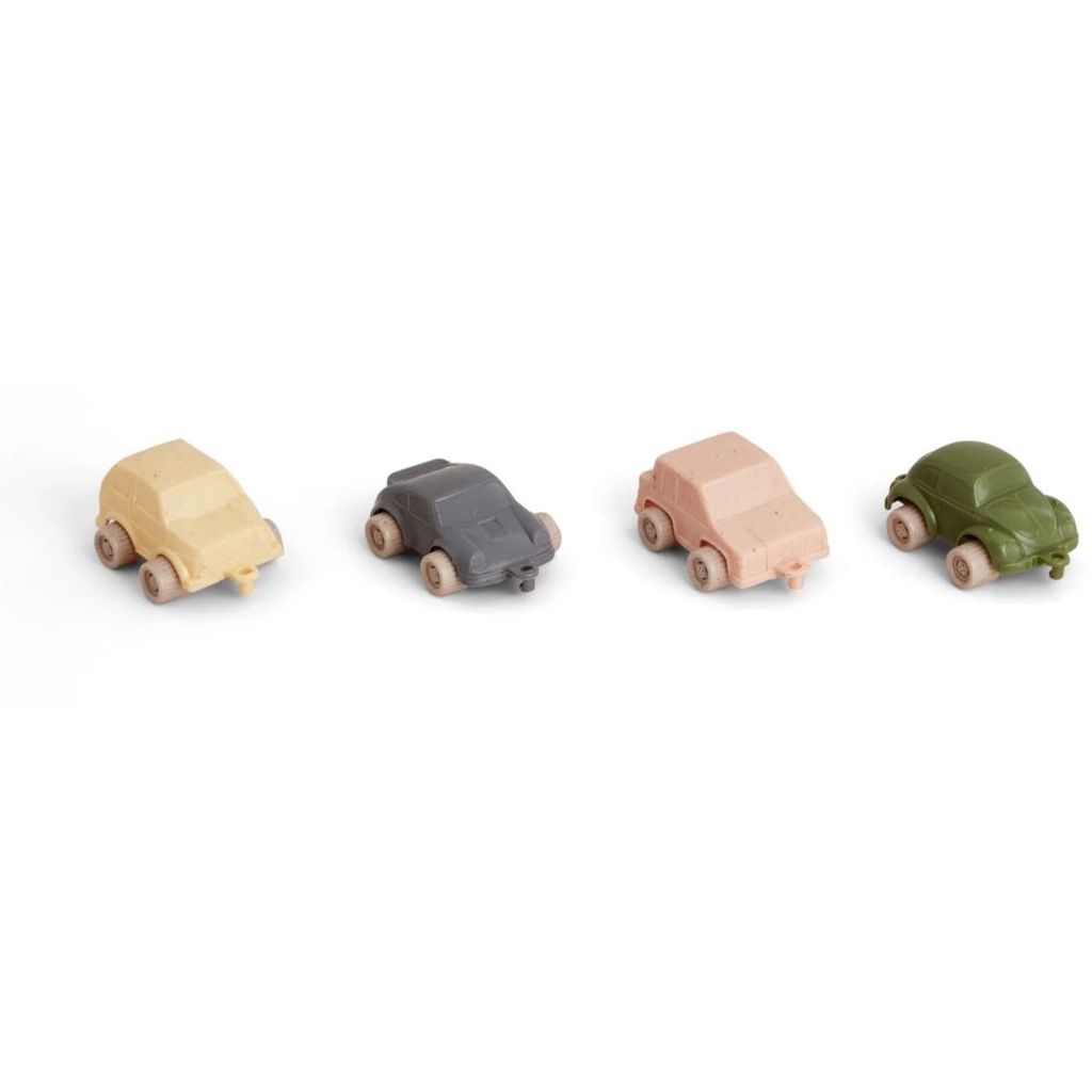 Bilerne ligner en Porsche, en VW Beetle, en Golf og en Volvo. Bilerne er ca. 8 cm lange.