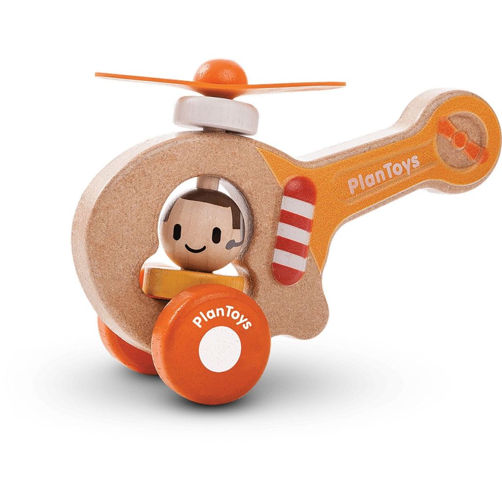 PlanToys-helikopter med en pilot, hvis hoved roterer, og propellen drejer rundt, mens hjulene ruller.