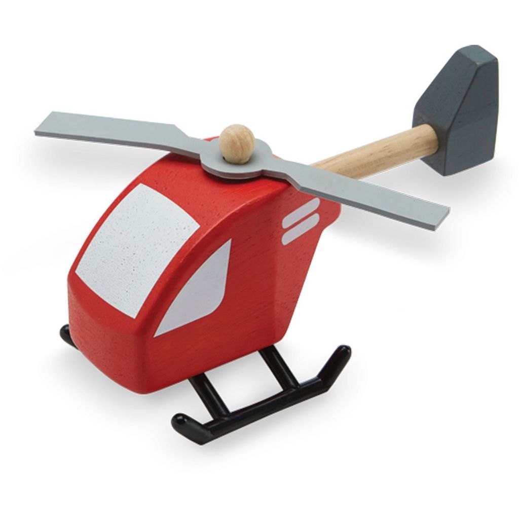 Rød træhelikopter fra PlanToys. Rotorbladene er lavet af gummi.