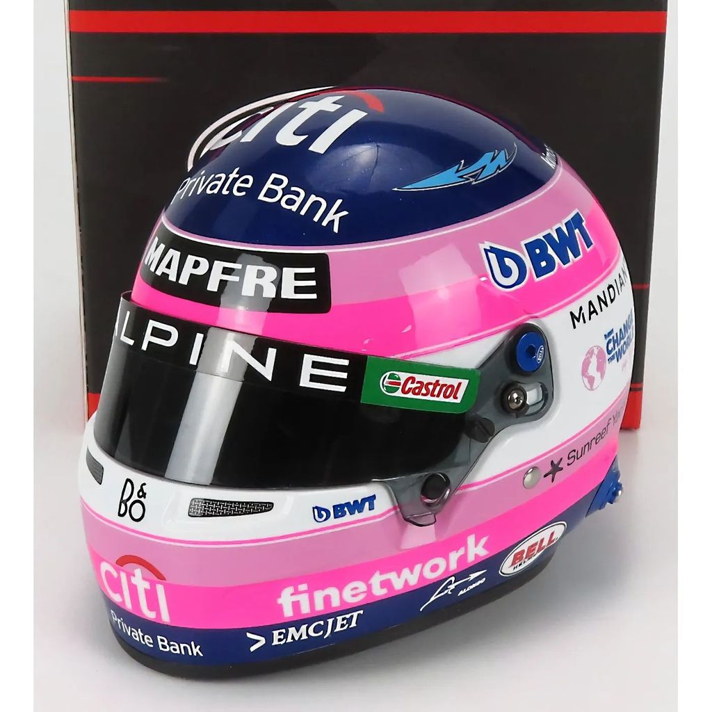 Minihjelm i skala 1:2 (ca. 18 cm bred og 13 cm høj), der forestiller Fernando Alonsos hjelm fra 2022 fra Bell Helmets. I 2022-sæsonen kørte Alonso bil nr. 14 for BWT Alpine F1 Team.