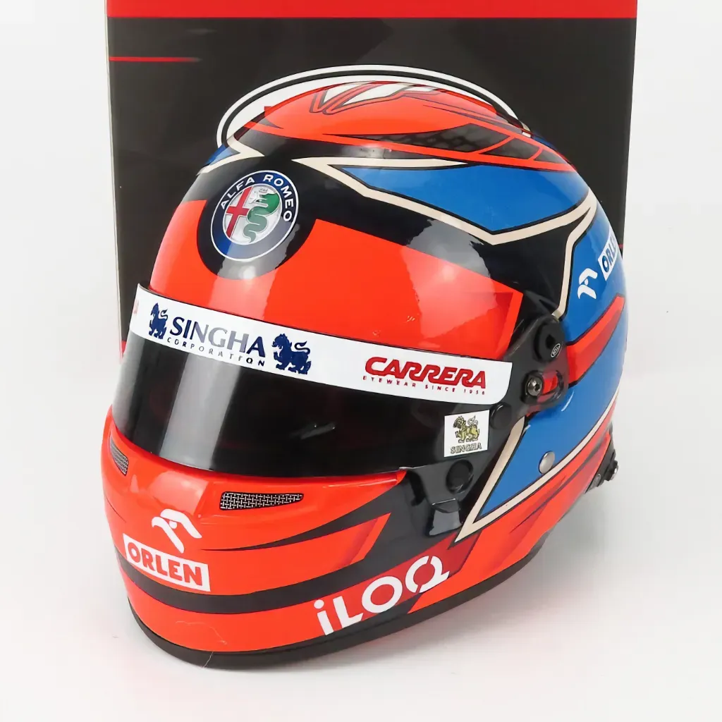 Dette er en identisk kopi af Kimis hjelm, som kan stå stolt på din bogreol, gerne sammen med en flot model af den aktuelle Formel 1-bil, som i dette tilfælde vil være Alfa Romeo C41 #7.