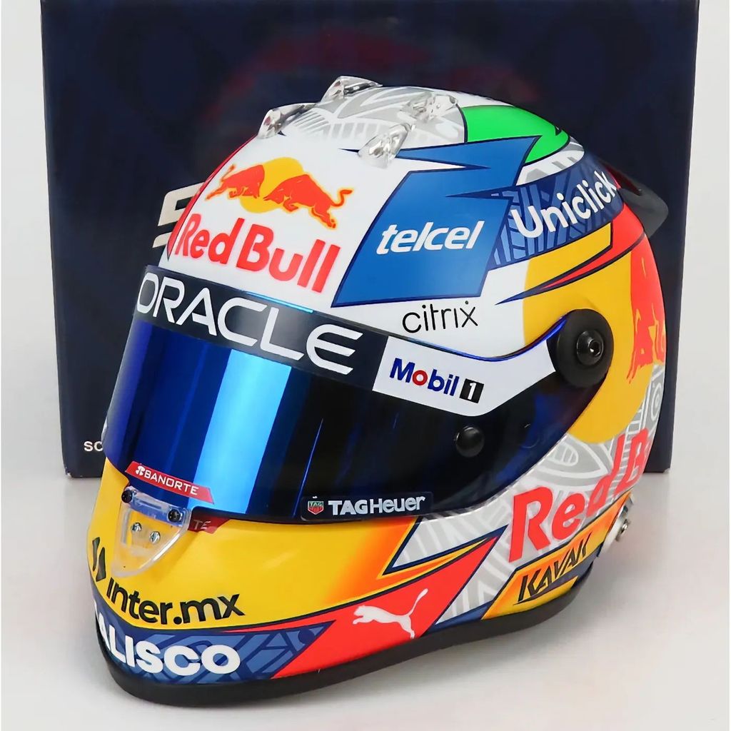 Minihjelm i skala 1:2 (ca. 18 cm bred og 13 cm høj), der forestiller Sergio Pérez' hjelm fra 2022 fra Schuberth. I 2022-sæsonen kørte Pérez i bil nr. 11 for Oracle Red Bull Racing-teamet.