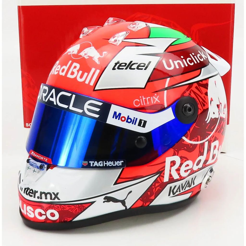 Minihjelm i skala 1:2 (ca. 18 cm bred og 13 cm høj), der forestiller Sergio Pérez' hjelm fra 2022 (Østrigs GP) fra Schuberth. I 2022-sæsonen kørte Pérez bil nr. 11 for Oracle Red Bull Racing-teamet.
