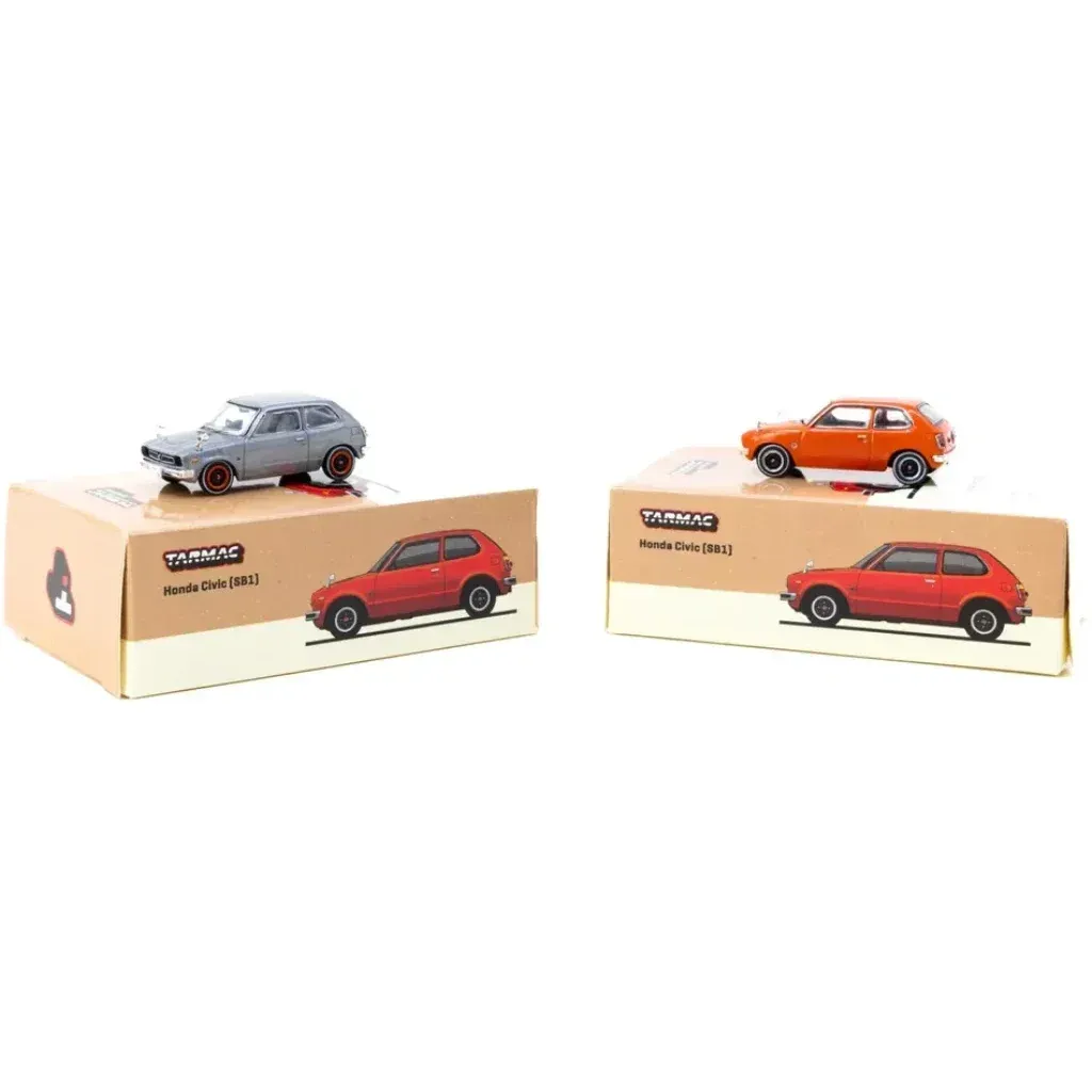 Orange Honda Civic (SB1) fra modelbilproducenten Tarmac Works i samarbejde med J Collection og COLLAB64-serien i skala 1:64 (ca. 7 cm).