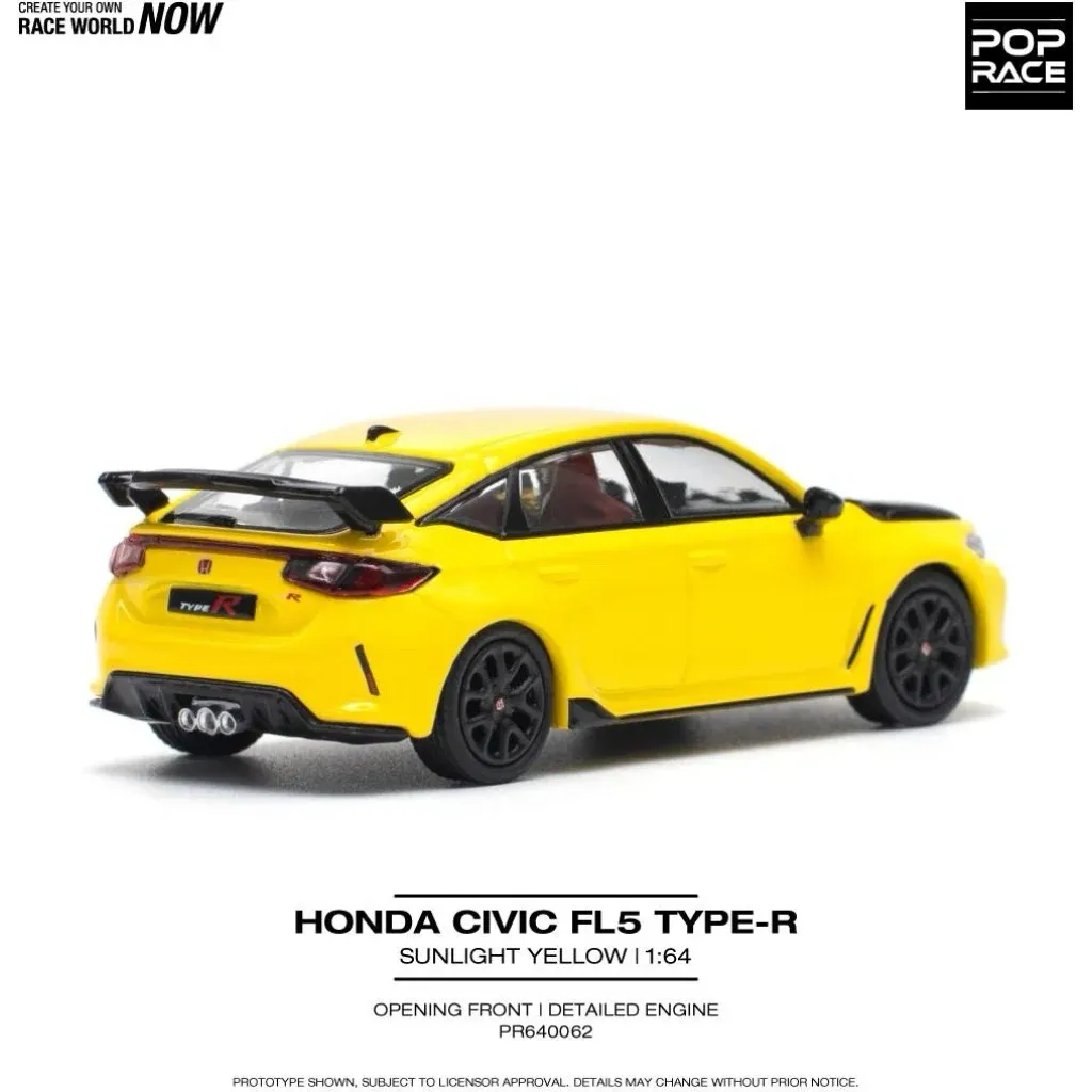 Honda Civic Type R FL5 i gul (Sunlight Yellow) fra Pop Race i skala 1:64 (ca. 7 cm).